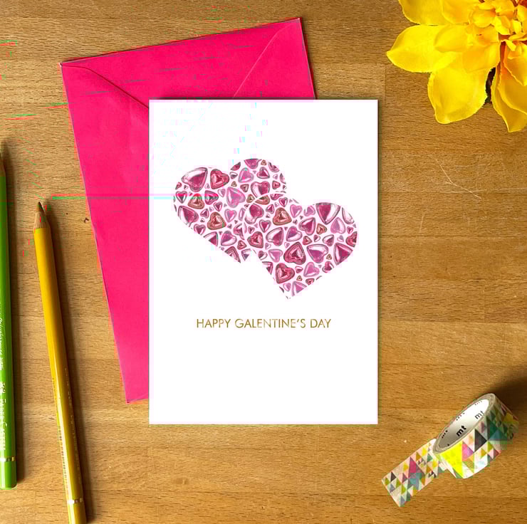 Celebrate the love, laughter, and friendship you share with your favourite gal pals this Galentine’s Day with this charming and playful greetings card. Set against a clean white background, the design features two overlapping hearts filled with hand-drawn foil-wrapped chocolate hearts in every shade of pink, creating a sweet and joyful illustration that’s full of personality.