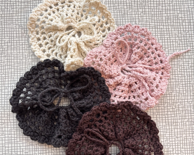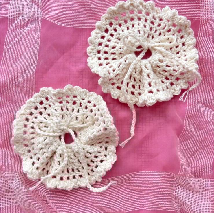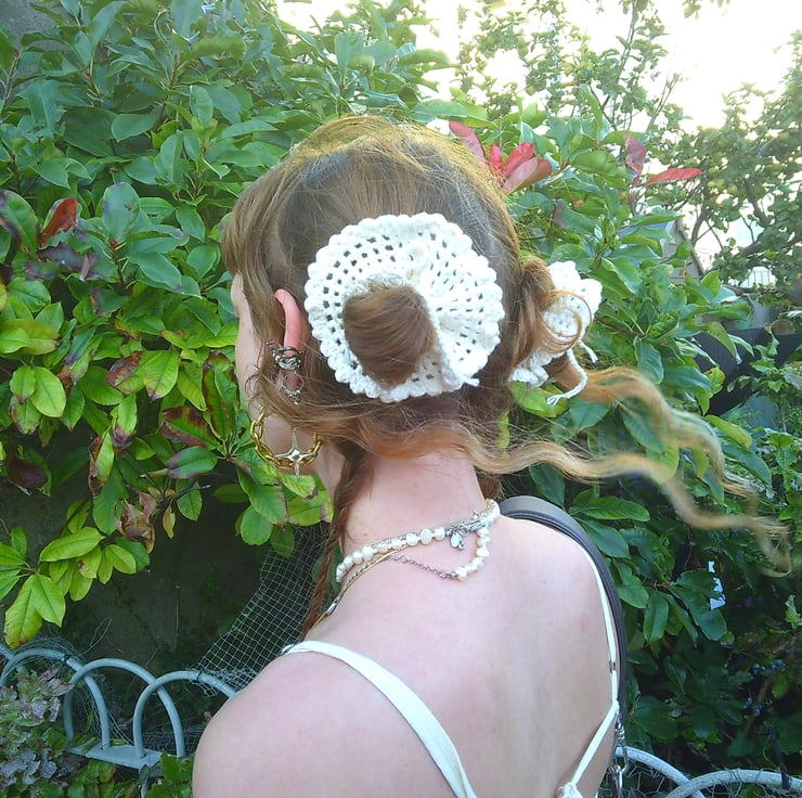 Handmade crochet hair accessories inspired by vintage lace doilies. Size measures approx. 20cm cm across. Secures with a drawstring to tighten to desired size.