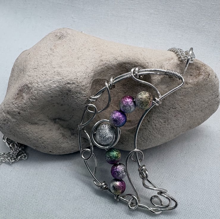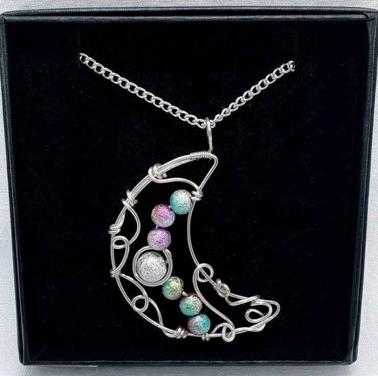 Silver plated copper wire wrapped crescent moon pendant with silver and rainbow coloured druzy beads.