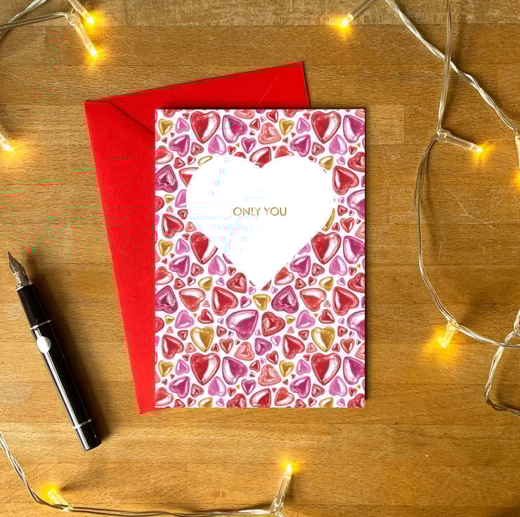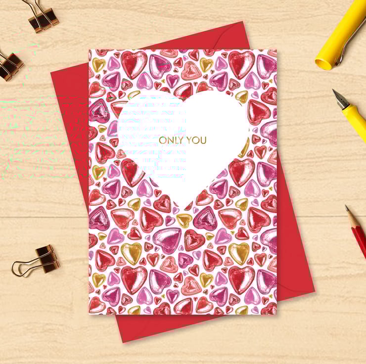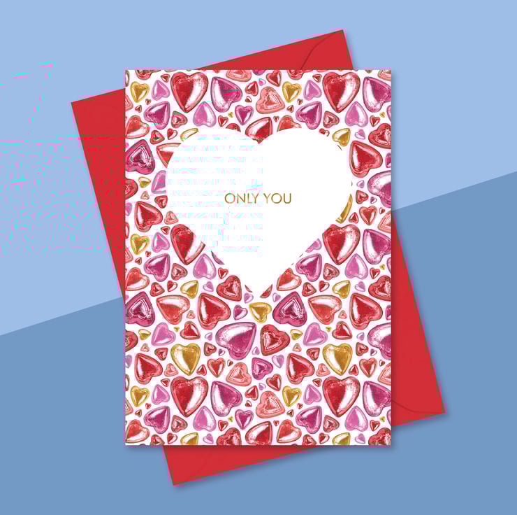 Featuring hand-drawn foil-wrapped chocolate hearts in rich shades of red, pink, and gold, this romantic design feels indulgent, playful, and full of warmth. Paired with a bold red envelope, it makes a beautiful statement before it’s even opened.