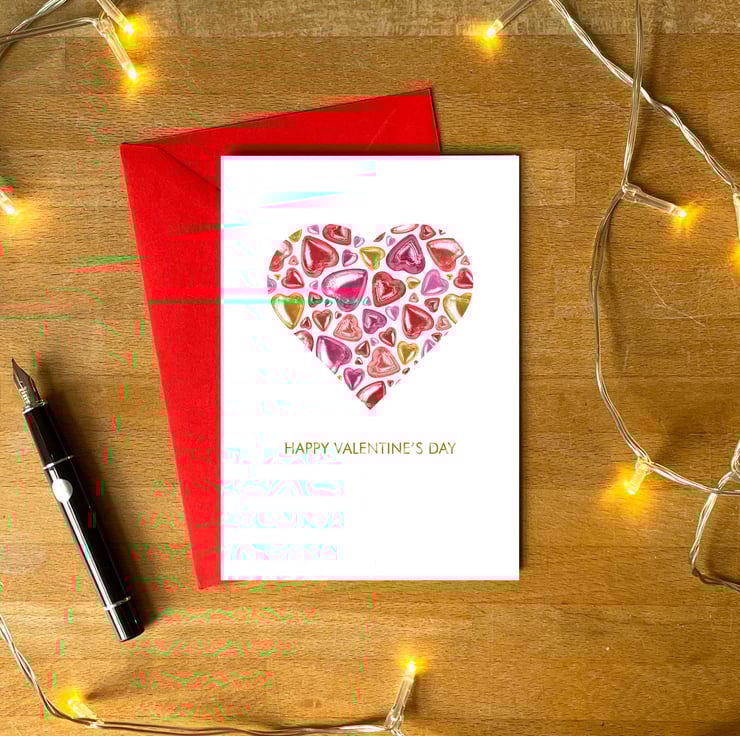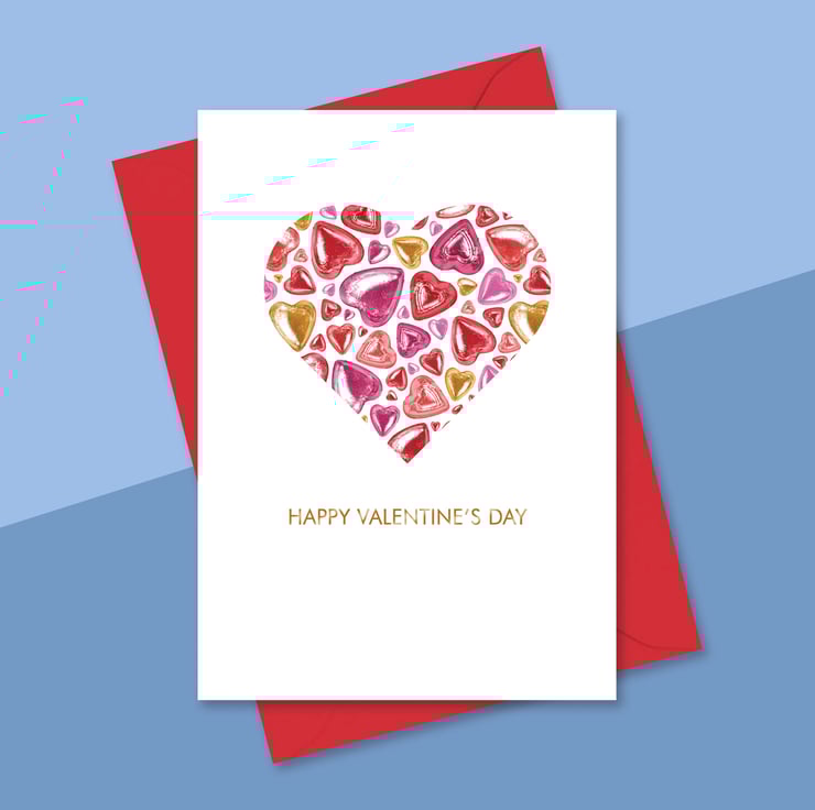 Celebrate love in all its sweet and stylish glory with this beautiful Valentine’s Day greetings card. Featuring a bold heart filled with hand-drawn foil-wrapped chocolate hearts in rich shades of red, pink, and gold, this charming design is full of warmth and affection. Paired with a classic red envelope, it makes a striking and romantic statement from the moment it’s received.