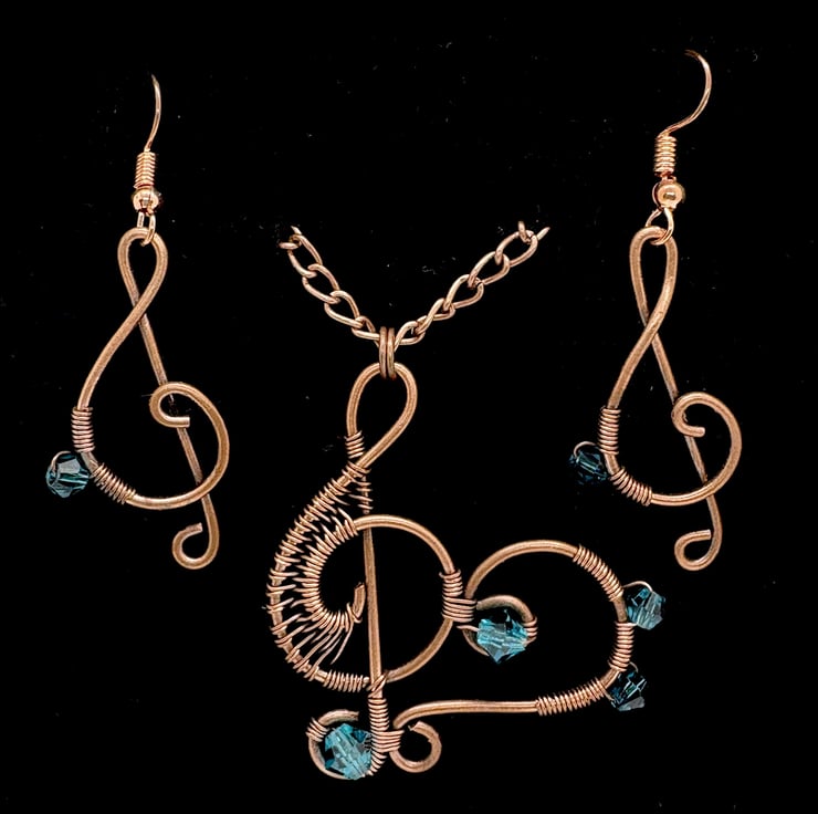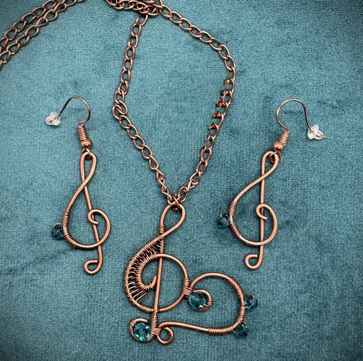 Antique copper wire wrapped musically themed earring and pendant set with turquoise blue glass bi-cone beads from a well-known Austrian crystal manufacturer. Made with tarnish resistant copper earring fish-hook fastenings and 20"/50cm antique copper chain.