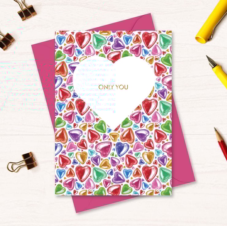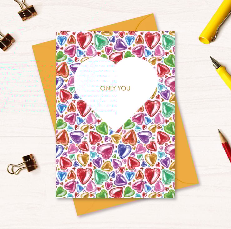 Celebrate love in all its vibrant forms with this cheerful Valentine’s Day or Pride greetings card. Featuring a bold heart filled with foil-wrapped chocolate hearts in a beautiful rainbow of colours, this design adds a playful touch while symbolising the spectrum of love, inclusivity, and diversity.