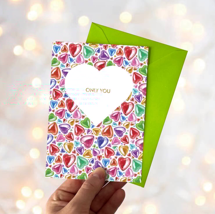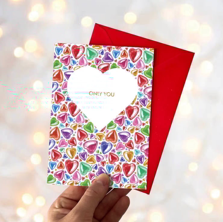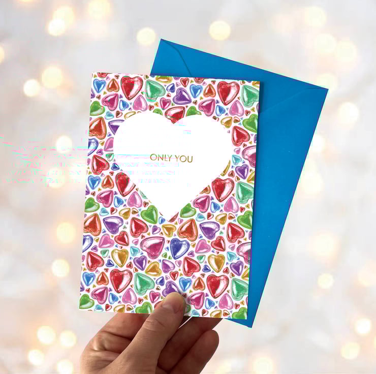 This design was inspired by the joyful celebration of love in all its forms. The rainbow foil-wrapped chocolate hearts represent diversity, inclusivity, and the playful sweetness of sharing love with someone special. Each colour reflects warmth, positivity, and connection, making this card a meaningful keepsake for Valentine’s Day, Pride, or any occasion when love deserves to be celebrated openly.
