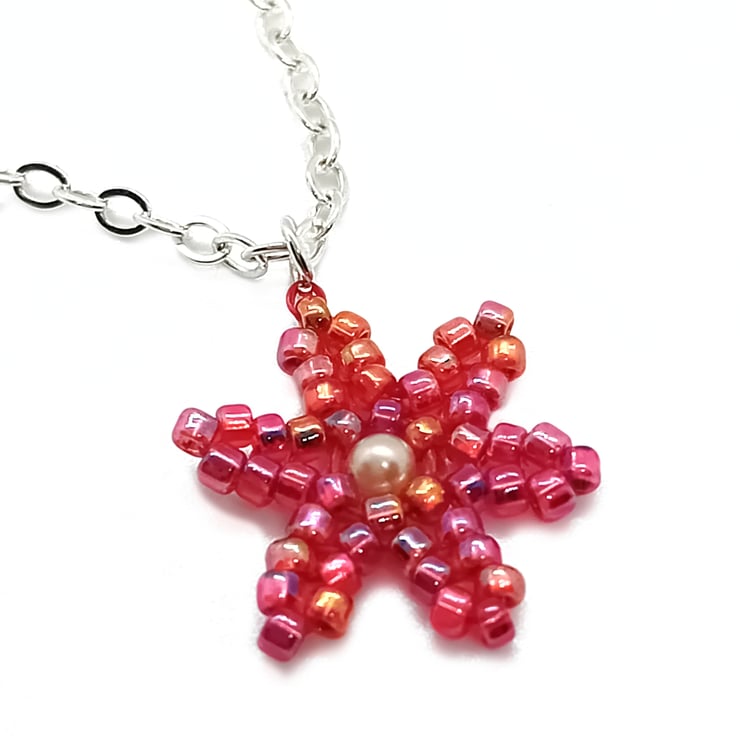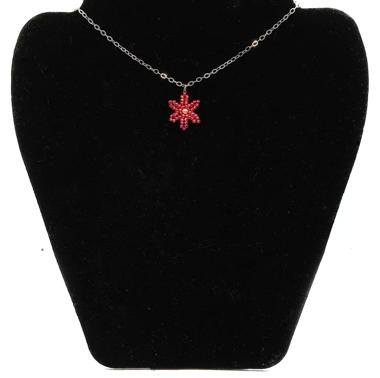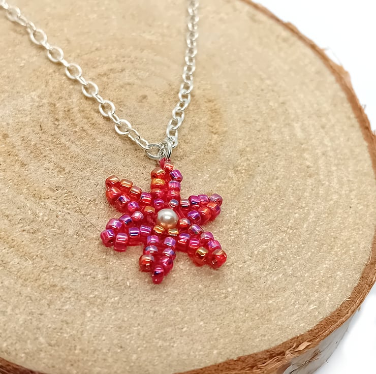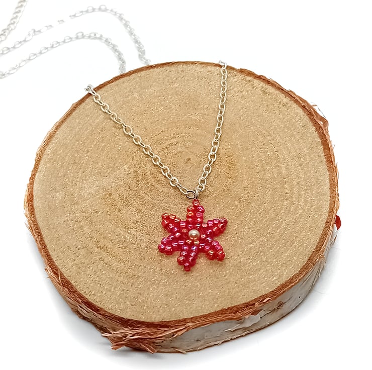 This red and pearl flower beaded pendant trace silver chain necklace has been carefully made using herringbone and peyote beading techniques, with red rainbow beads and a faux pearl bead. The pendant adorns a trace silver chain with silver plated clasp.