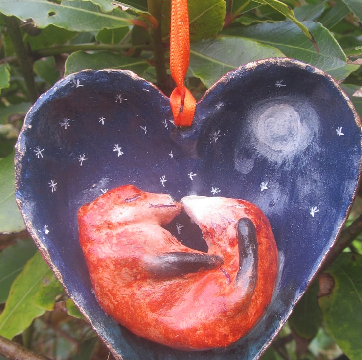 Paper mache heart shaped Christmas decoration, handmade in Cornwall from recycled materials. This sweet little fox is curled up asleep under a moonlit sky, it measures approx. 9 cm x 9 cm and would look lovely either on a tree or garland or on its own. Its also not just for Christmas and can grace your home all year round.