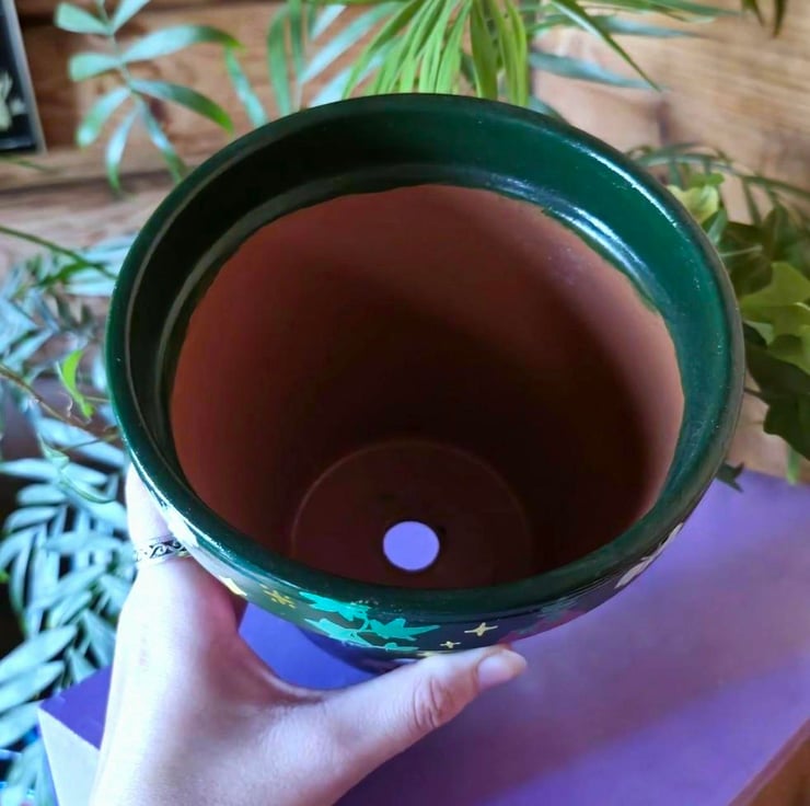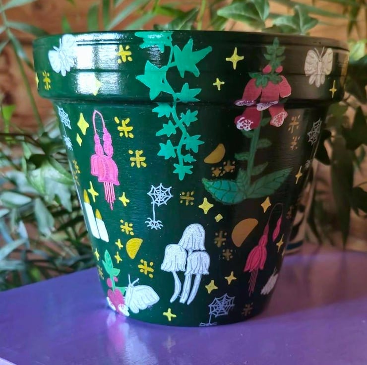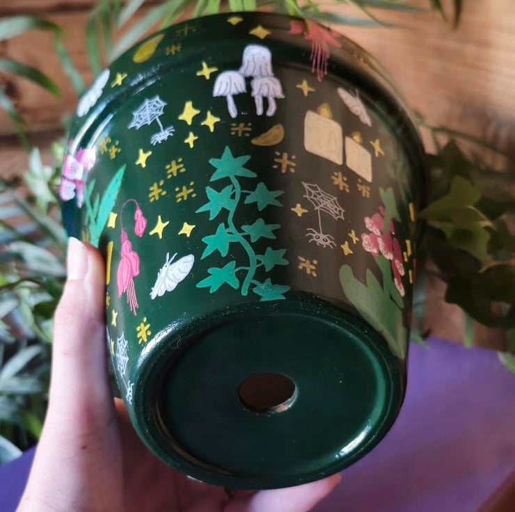 Hand painted pot featuring a magical array of flowers, mushrooms, candles and creatures all surrounded by stars.