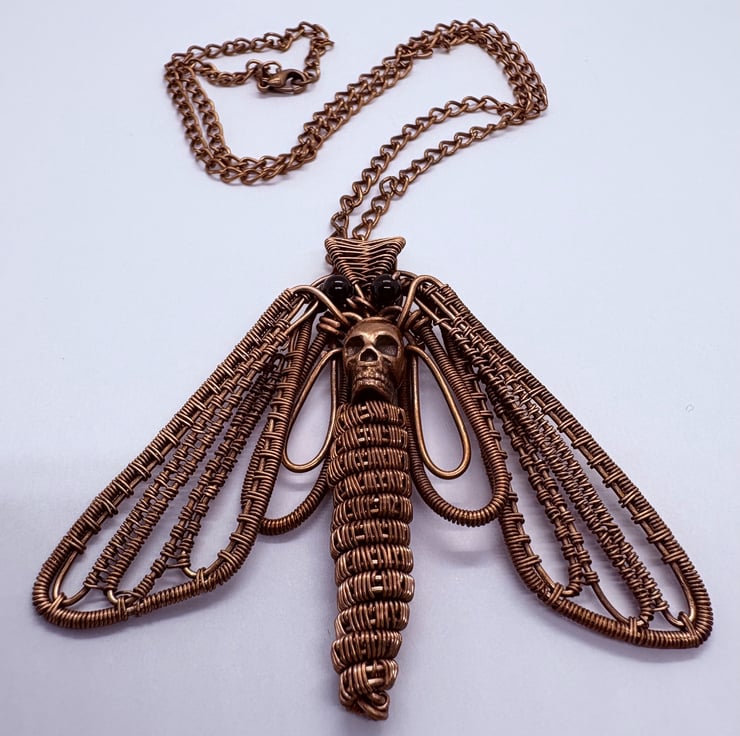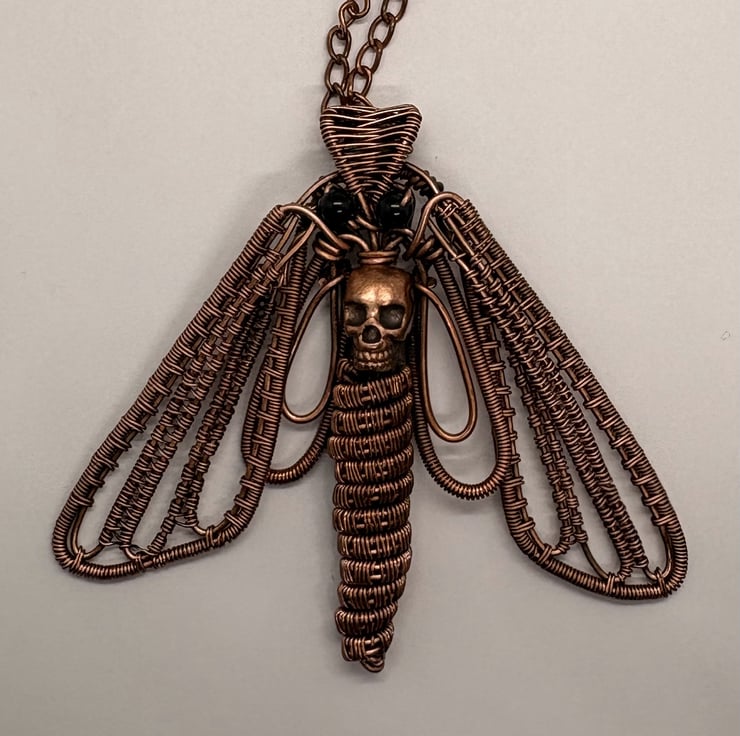 Antique copper wire wrapped Death's Head Hawksmoth with 3mm obsidian bead eyes and a solid copper skull at the centre. This pendant has many wire wrapping techniques incorporated.