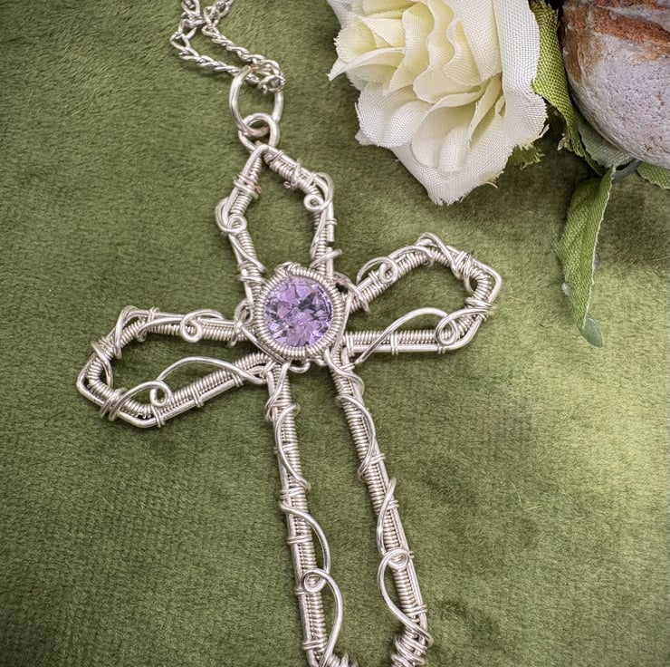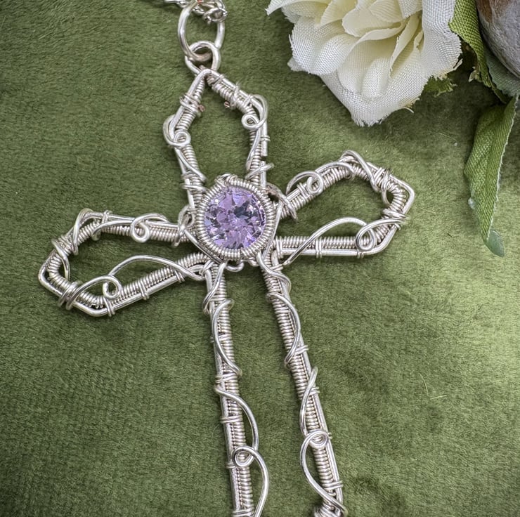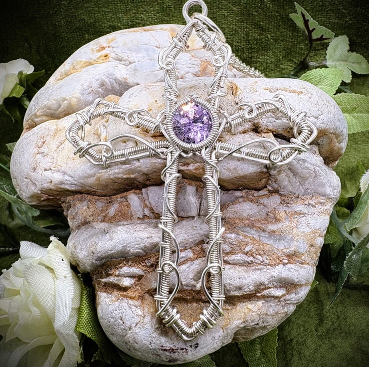 Silver plated copper wire wrapped large Crucifix pendant with a 10mm iridescent lilac and pale blue crystal focal point, I use glass crystals bought from a very well-known Austrian crystal manufacturer.