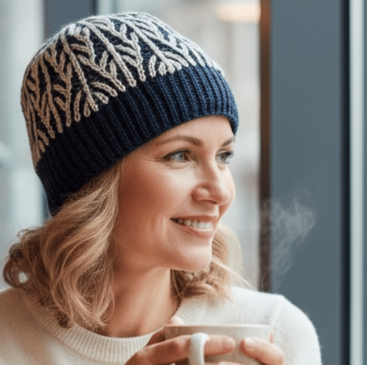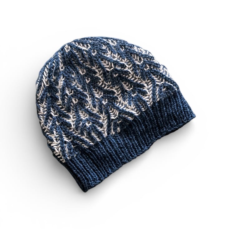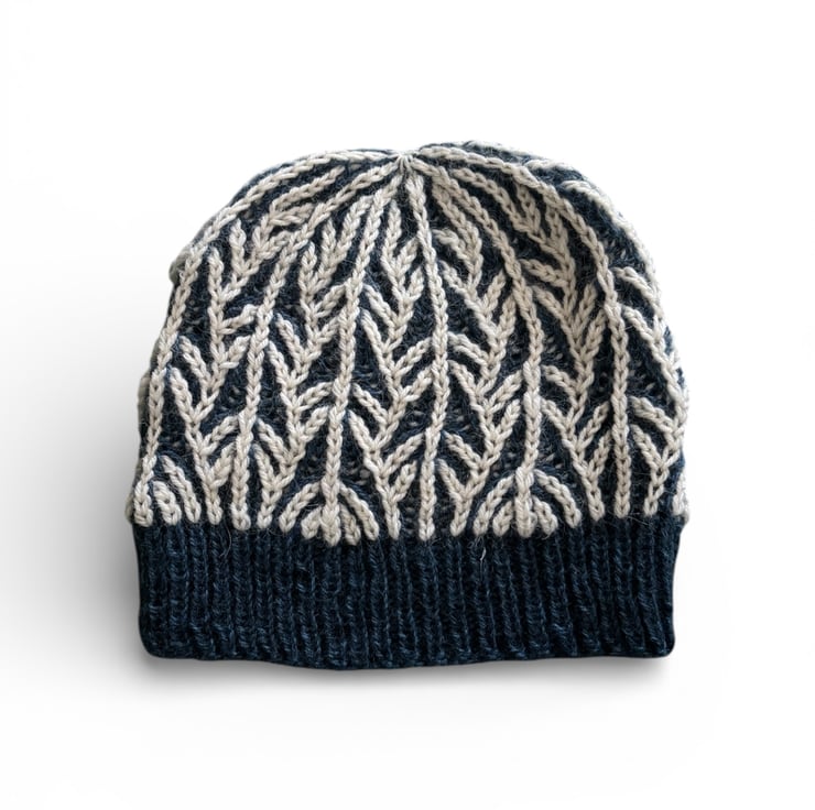 Beautiful 100% wool hand knitted beanie hat. Designed and knit by Sandra using the brioche technique in an overall art decor pattern which comes together at the crown in a star pattern. Pattern on the other side so the hat is totally reversible.