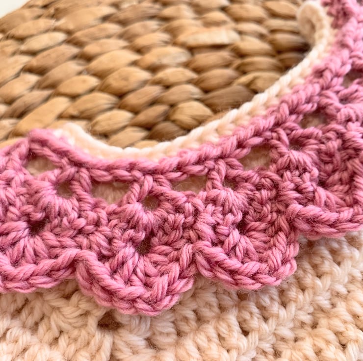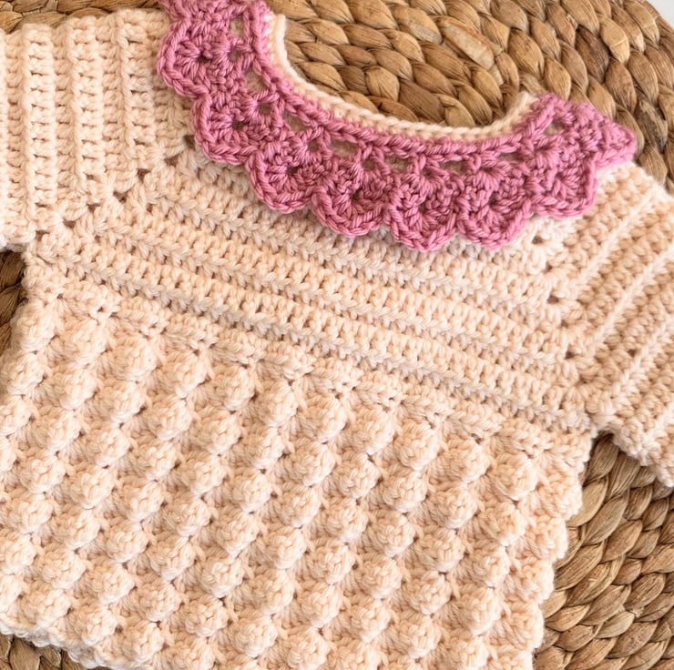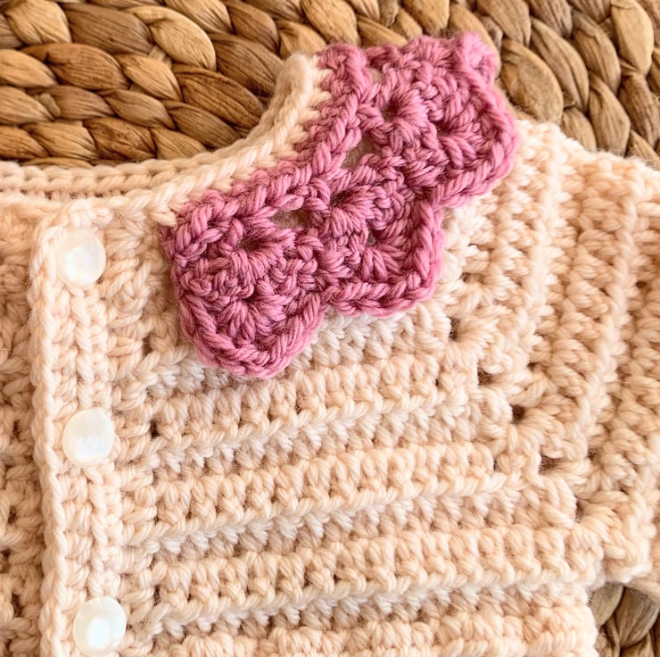This cardigan is crocheted using 100% merino wool, it is super soft for baby and because it’s a natural fibre it’s also breathable and helps to regulate baby’s temperature. The cardigan colour is Blush, it is creamy with the palest hint of pink tones. The collar is Rose Pink. The size is 0-3m.