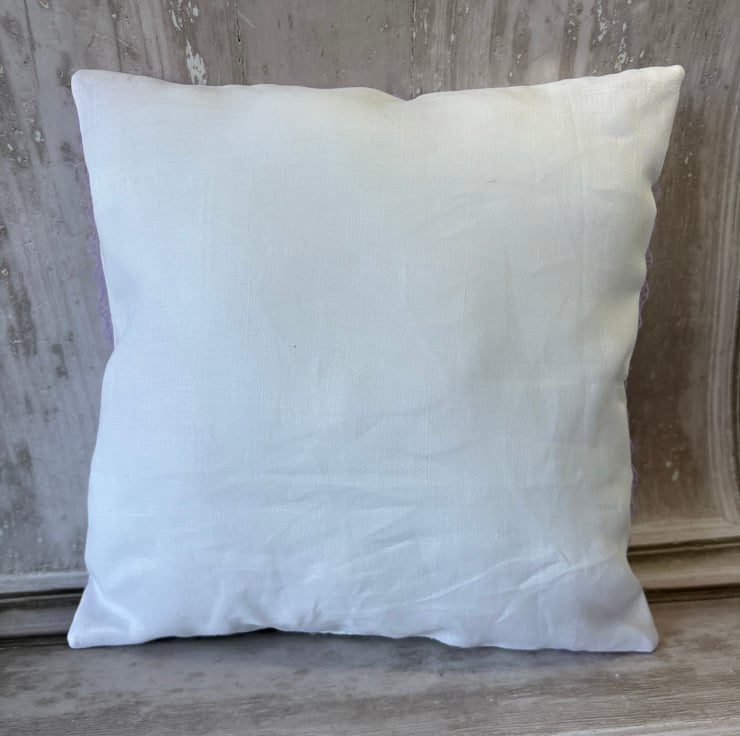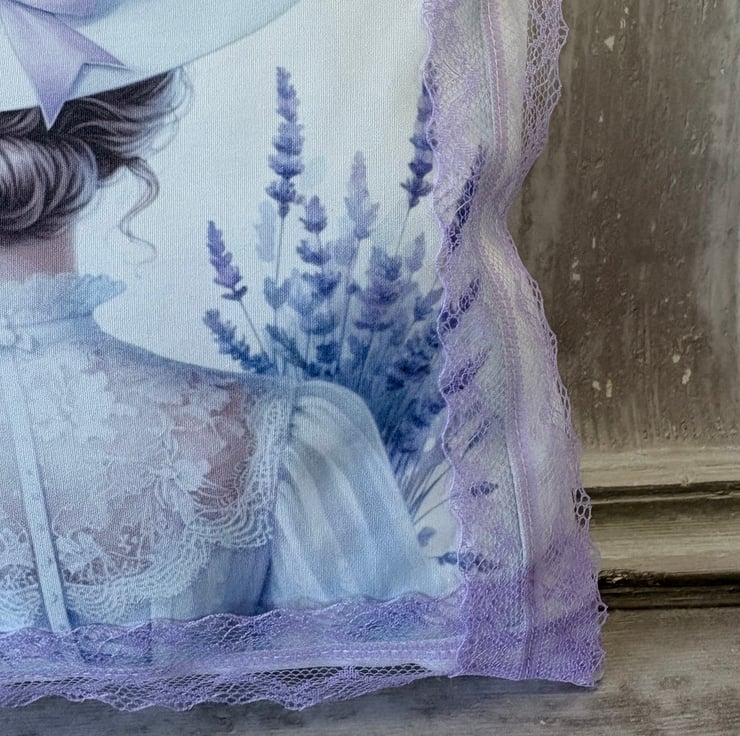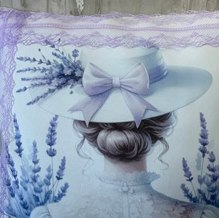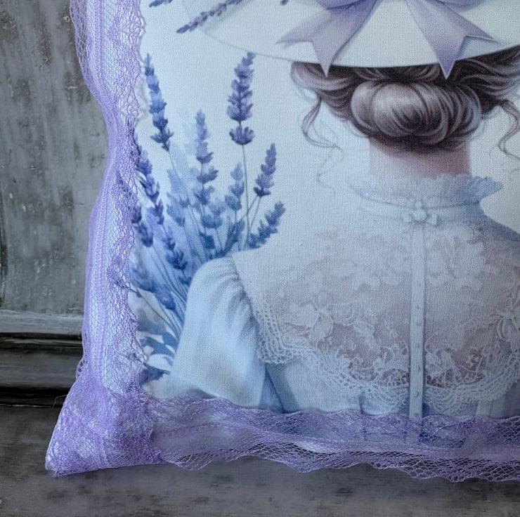A beautiful lady printed onto cotton fabric, linen edges and backing, filled with polyester fibrefill. Harvesting lavender in her pretty linen and lace dress, absorbing the delightful aroma around her in the lavender fields. Panel edged with lavender lace, as an accent. Measures 10" x 10". Add to your bed, dressing table of side chair. This is a purely decorative cushion, spot clean gently. Do not Wash or Dry Clean.