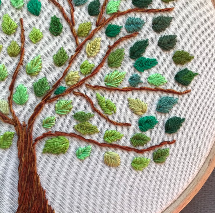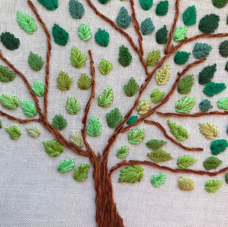 I do love designing embroidery trees. This tree is in full bloom in the Summer in various shades of green.