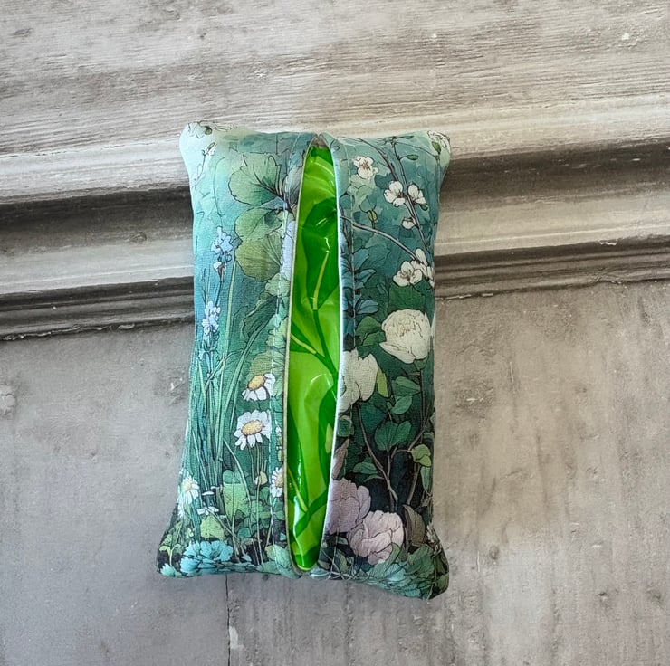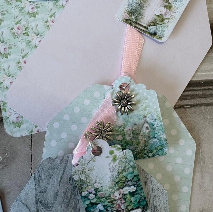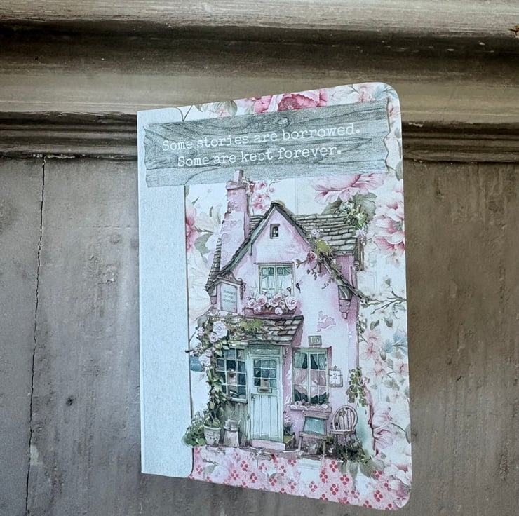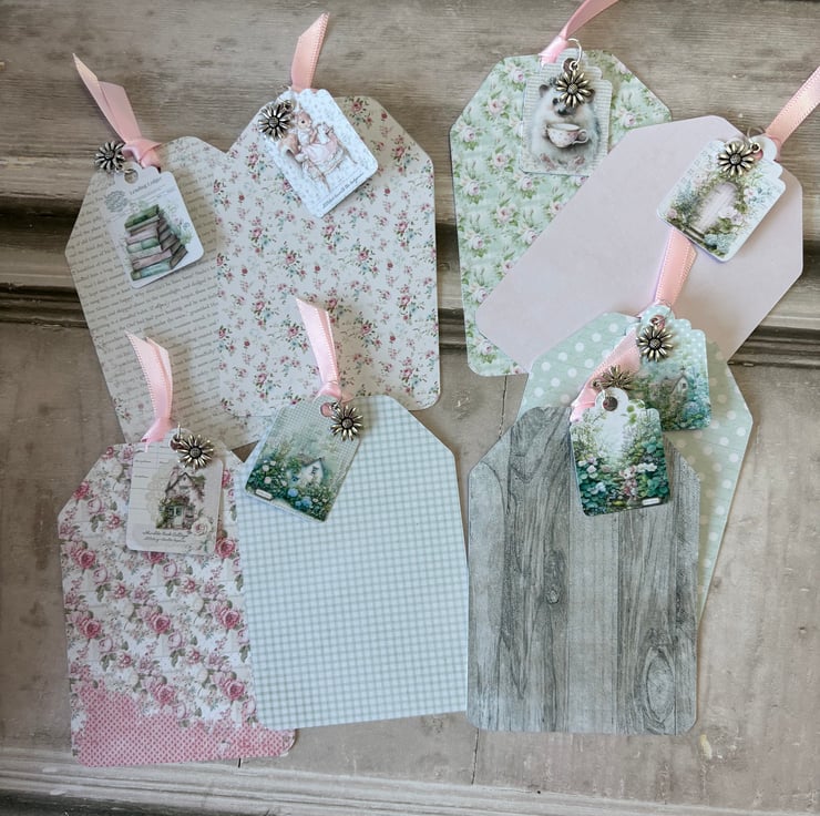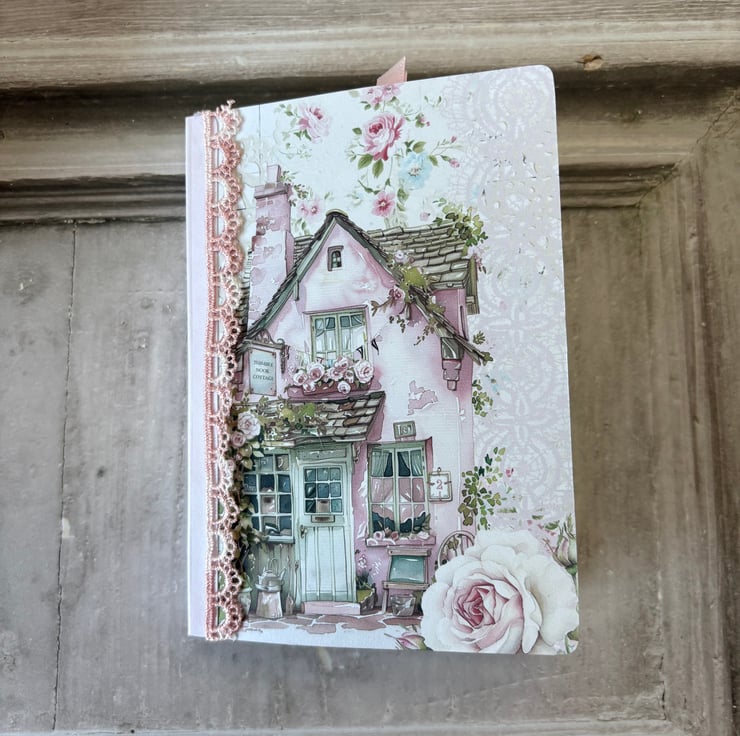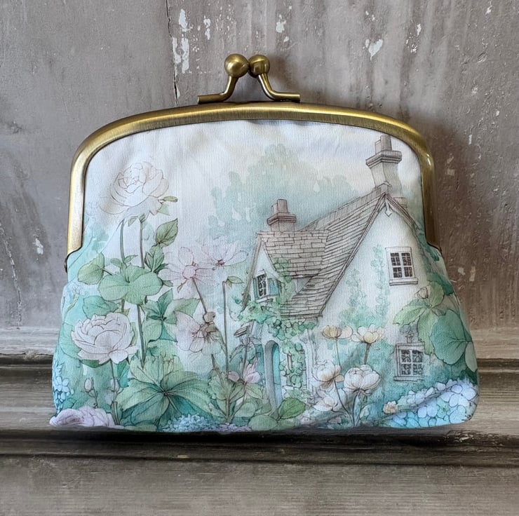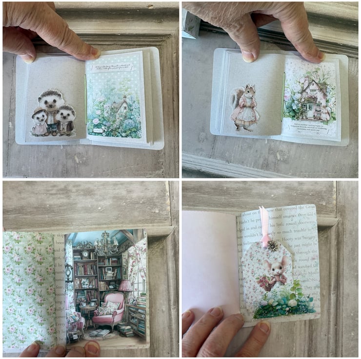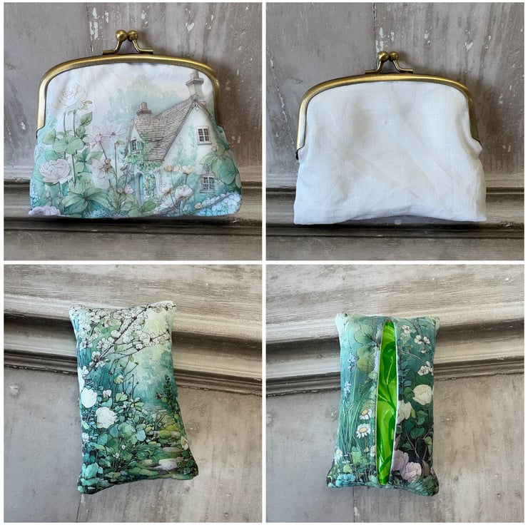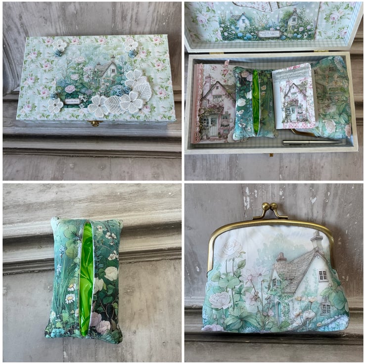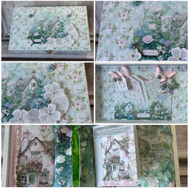 Wooden box, sealed with Gesso and covered with a designer rosebud paper on the outside and green check on the inside. White glitter felt on the bottom of the box. Image of Bramble Bend cottage, which sits at the end of the road just before the bend into the woods. Nestled amongst the wild flowers and roses. Decorated with blue paper roses and machine embroidered white flowers onto organza, with diamanté centres. Open to reveal pretty pocket in the lid with 8 large tags with mini tags, daisy charm and ribbon. Box contains a pretty mini journal with a pocket on the inside of both the front and back cover, holding a pretty tag with a chair. Beautiful prints to one side of the journal pages and a story book print on the back. Mini storybook with all the homes and animals in the Hollow. A tissue holder printed onto cotton of the hedgerow flowers. Clutch bag with antique brass frame, another image printed onto cotton of the Bramble Bend cottage, backed with winter white linen and lined with white on white mini floral print. Journal measures 5" x 3.5" x 5/8". Story book measures 3.75" x 2.5/8" x 0.5". Tissue holder measures 5" x 2.5". Frame bag 4" x 5" x 1.5" at base.