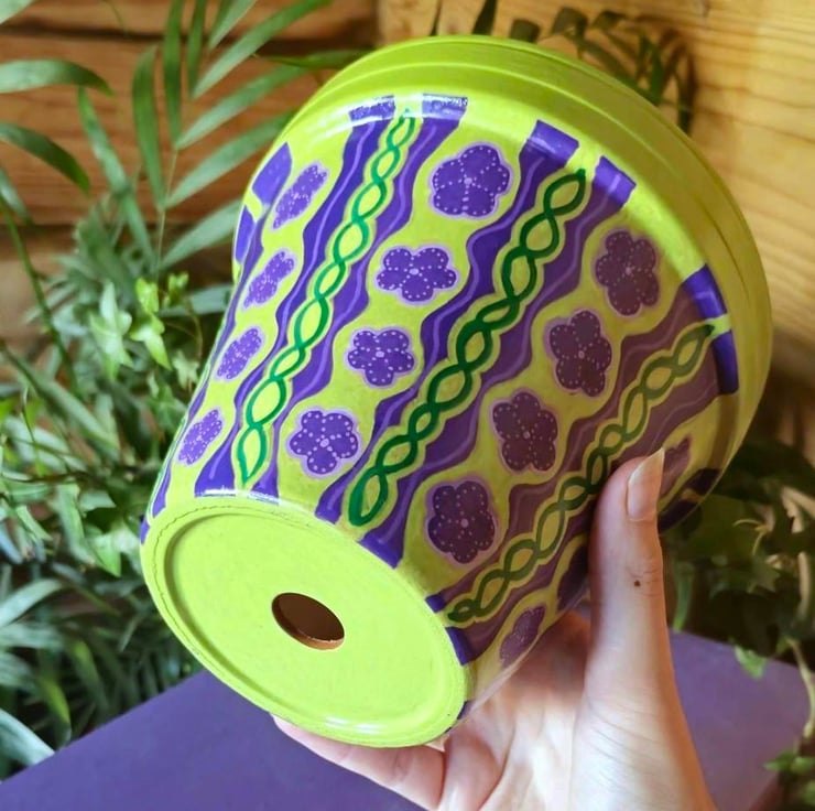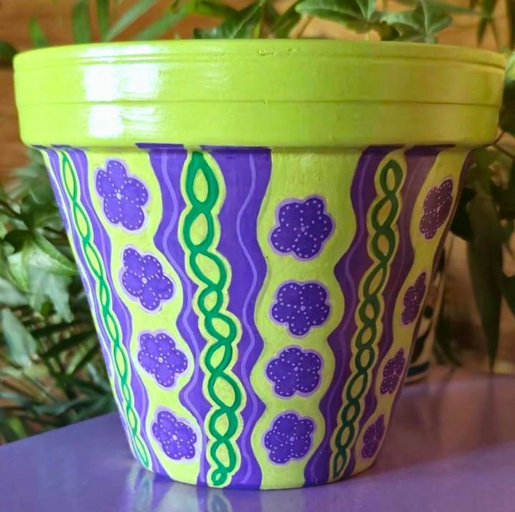 unique hand painted plant pot featuring funky retro purple flowers with green vines trailing down around them.