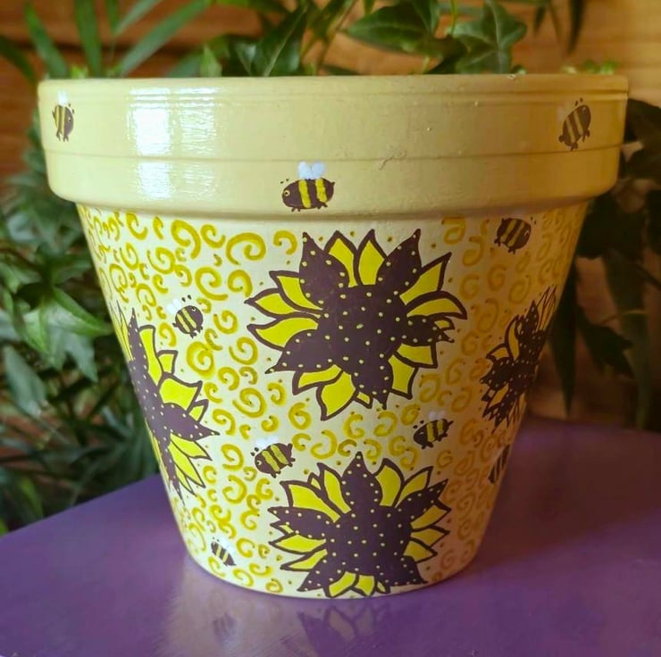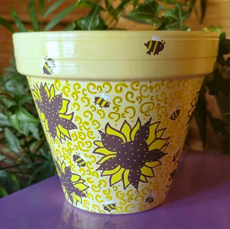 Hand painted plant pot featuring cute little bumblebees buzzing around big yellow sunflowers.