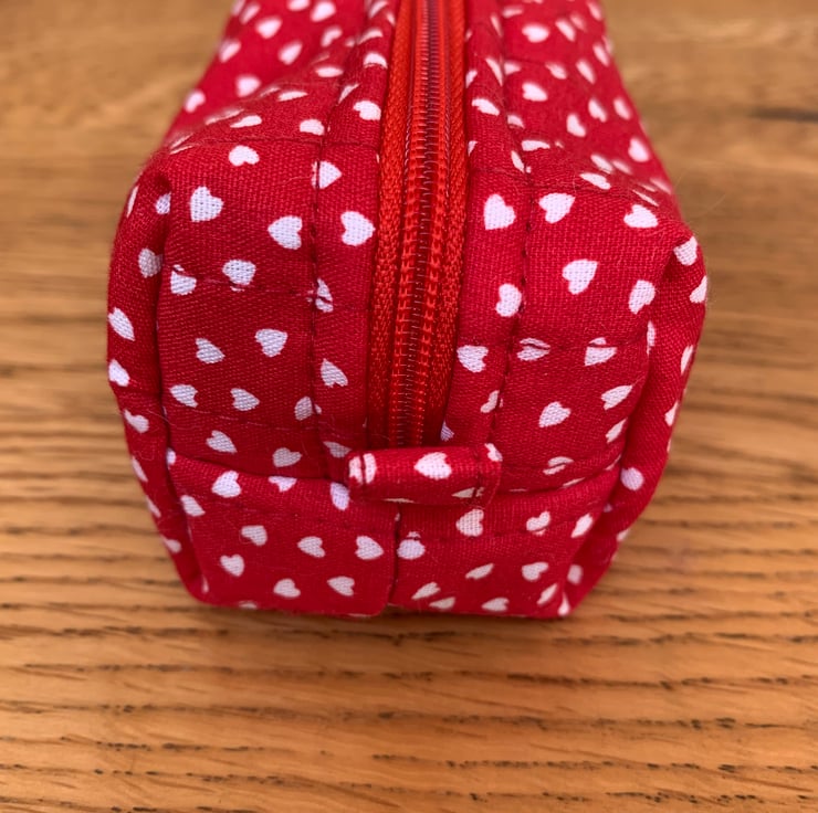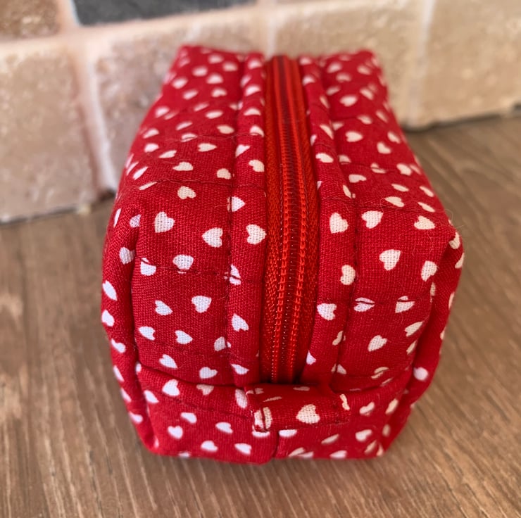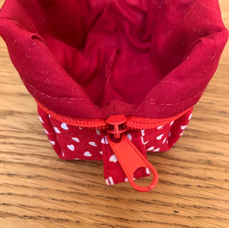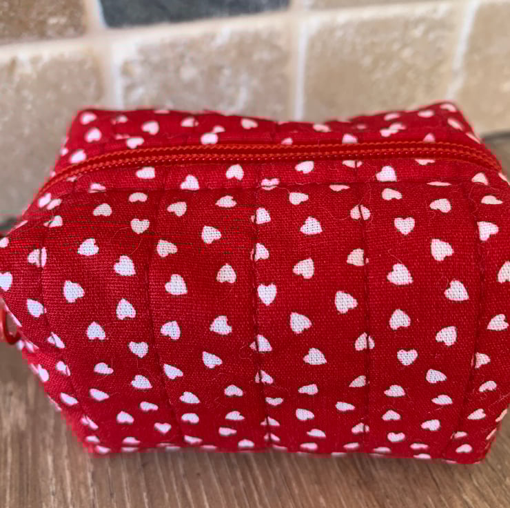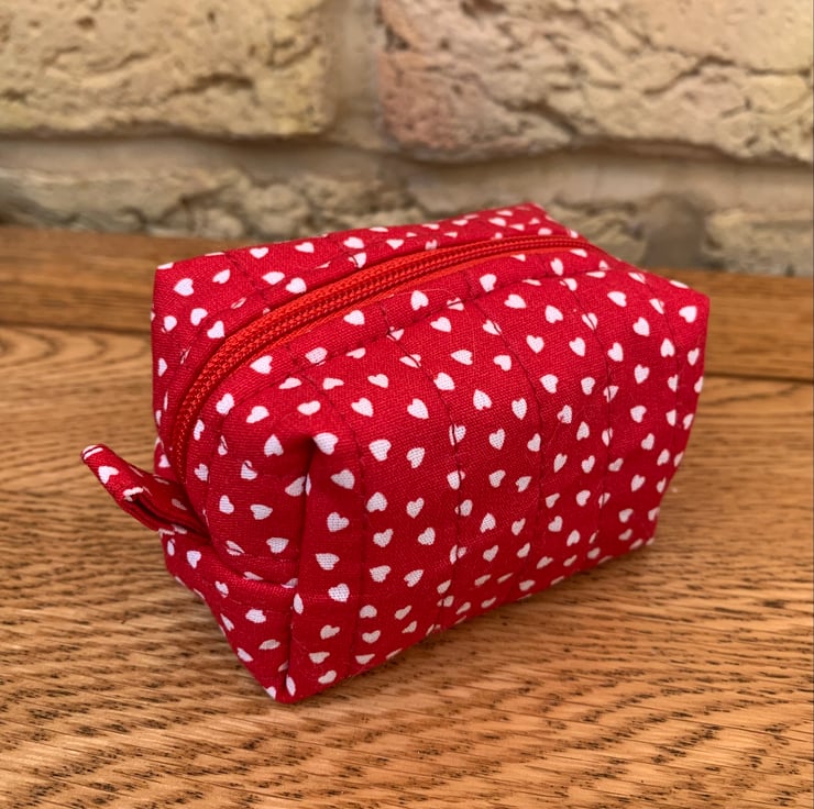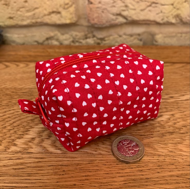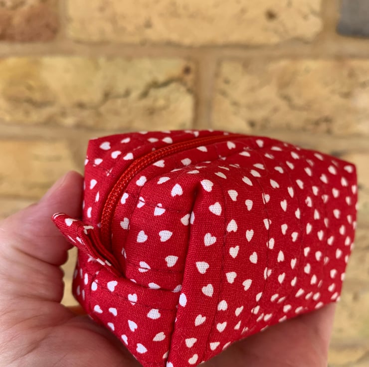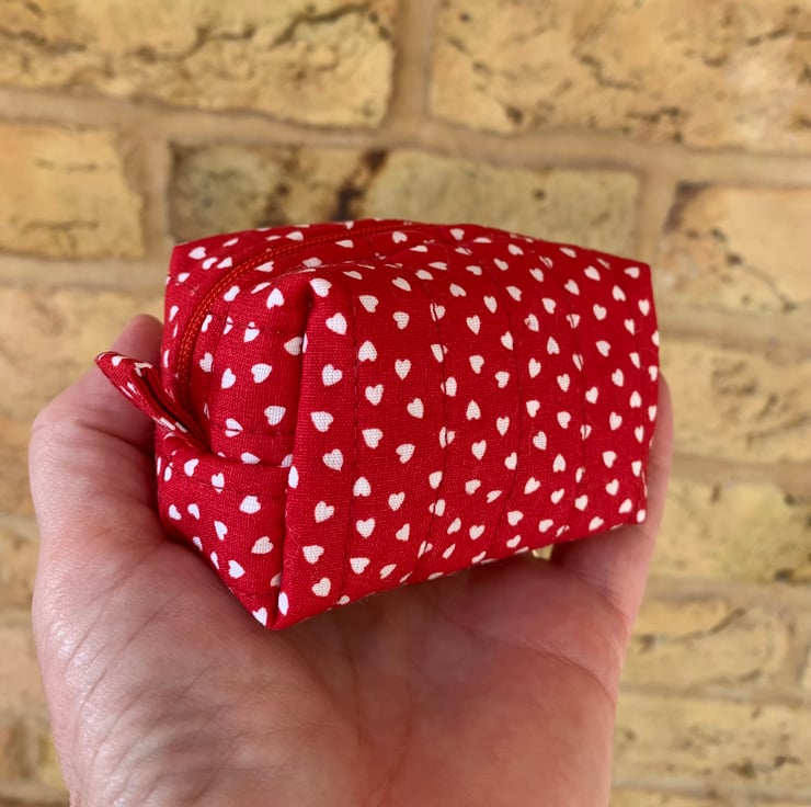 The mini box shape bag fits in the palm of your hand! It is made from this lovely red with white heart print cotton fabric. It has a dark red cotton lining with a red zip.