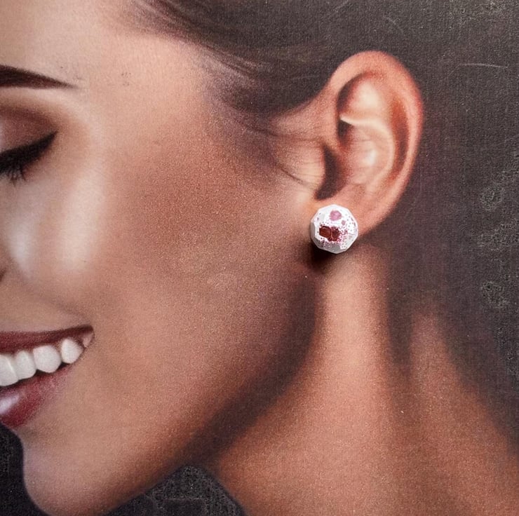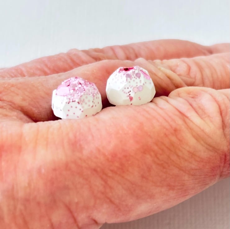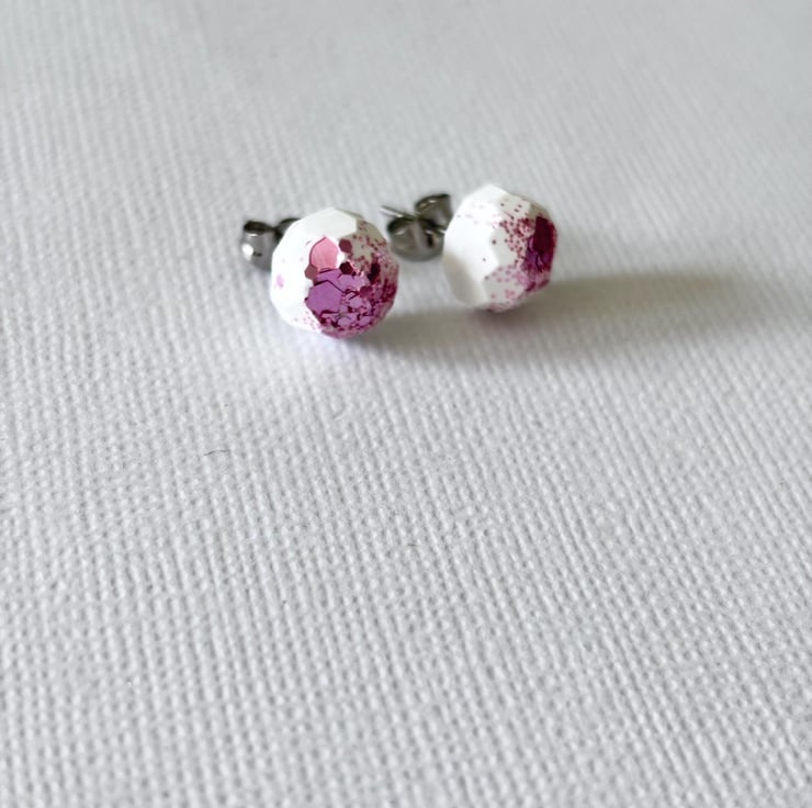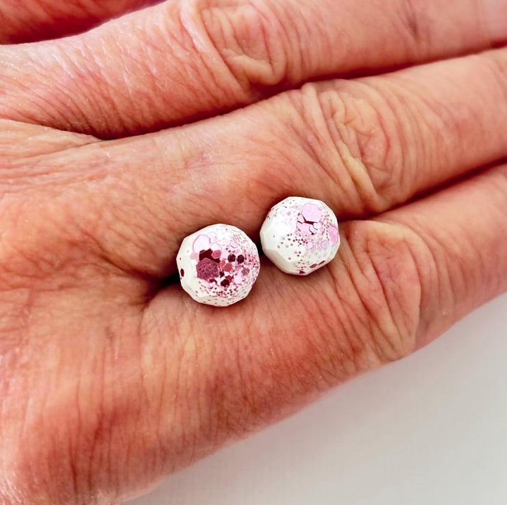 Add a touch of sparkle to your jewellery collection with these white eco-friendly clay studs with embedded sparkly pink glitter, they are the perfect blend of modern simplicity and sparkle. Handcrafted with care, theyre lightweight, comfortable, and designed for everyday wear or special occasions.