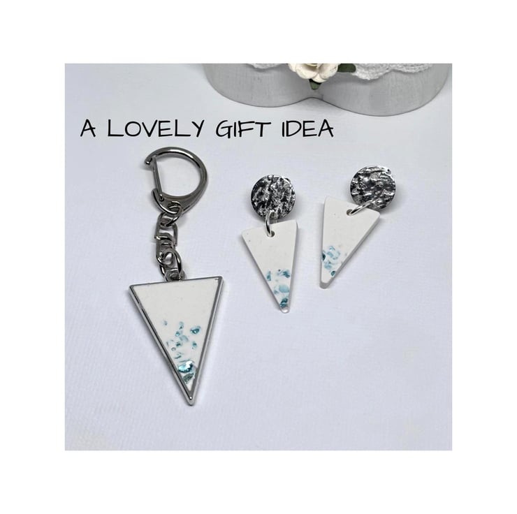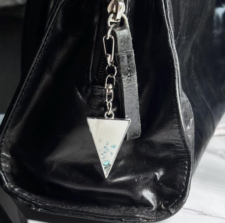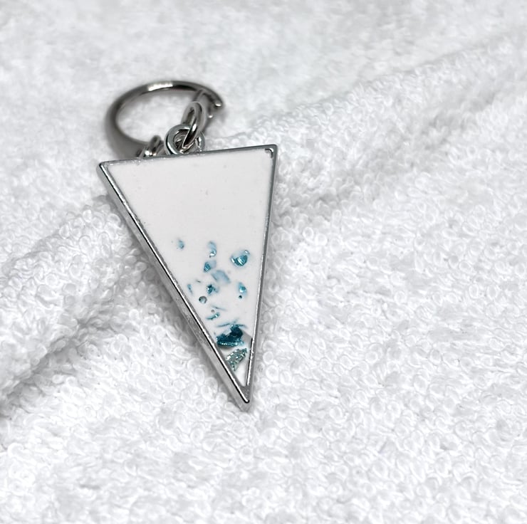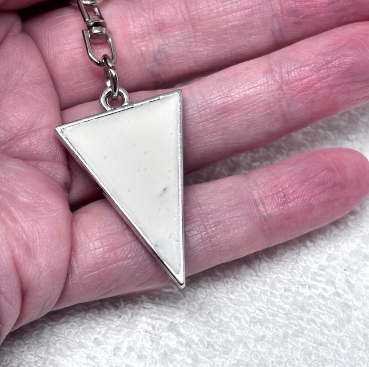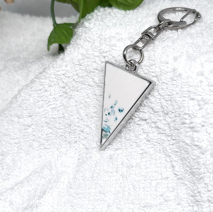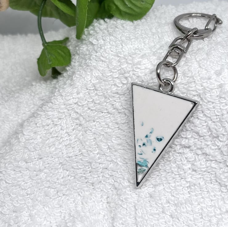 This handmade white Jesmonite triangle keyring features embedded green glass chips, creating a clean, modern design with subtle texture and sparkle. Finished with a silver-tone swivel clasp, it’s both stylish and practical – easy to attach to keys, bags or zips.