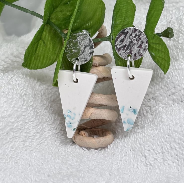 Handmade white Jesmonite triangle earrings featuring embedded green glass chips for a fresh, modern pop of colour. These lightweight geometric earrings are individually cast and finished by hand, making each pair completely unique.