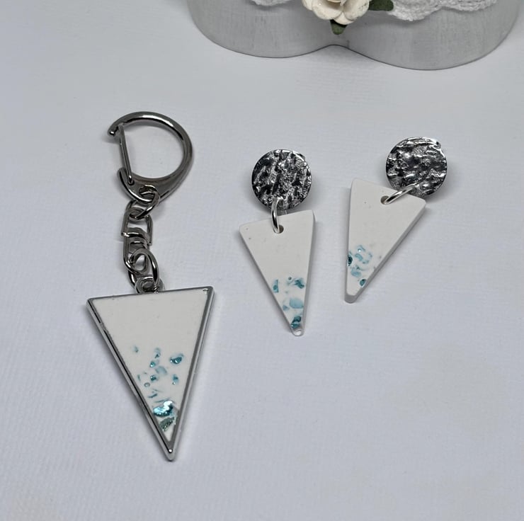 White Jesmonite Triangle Earrings with Green Glass Chips, Geometric Jewellery