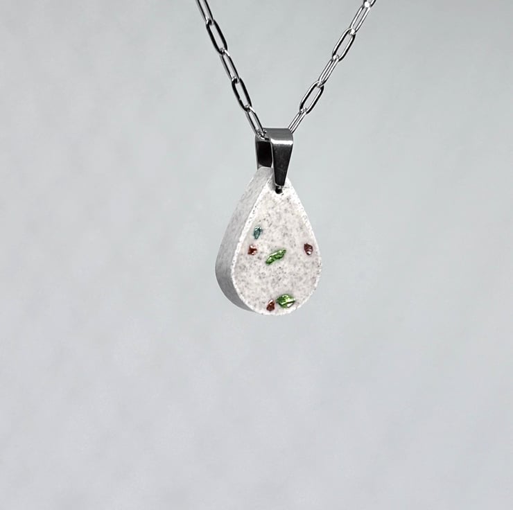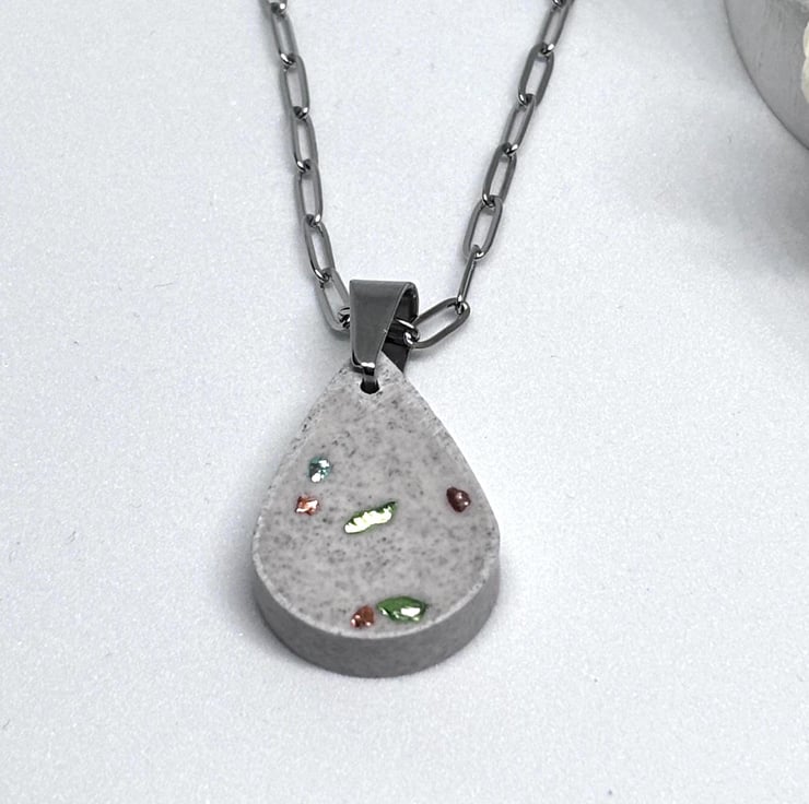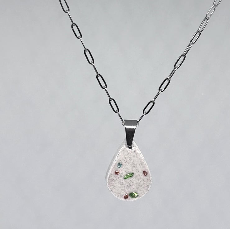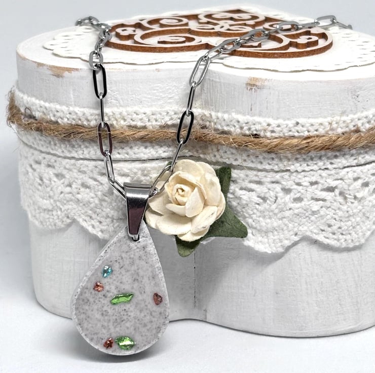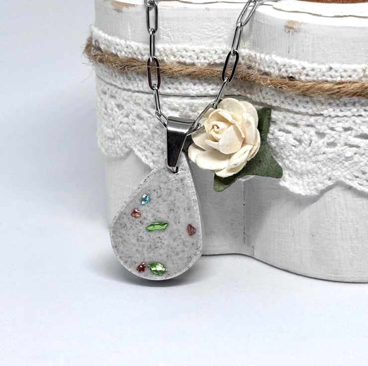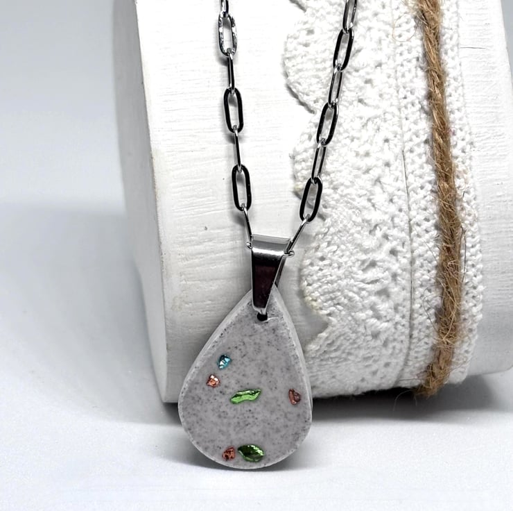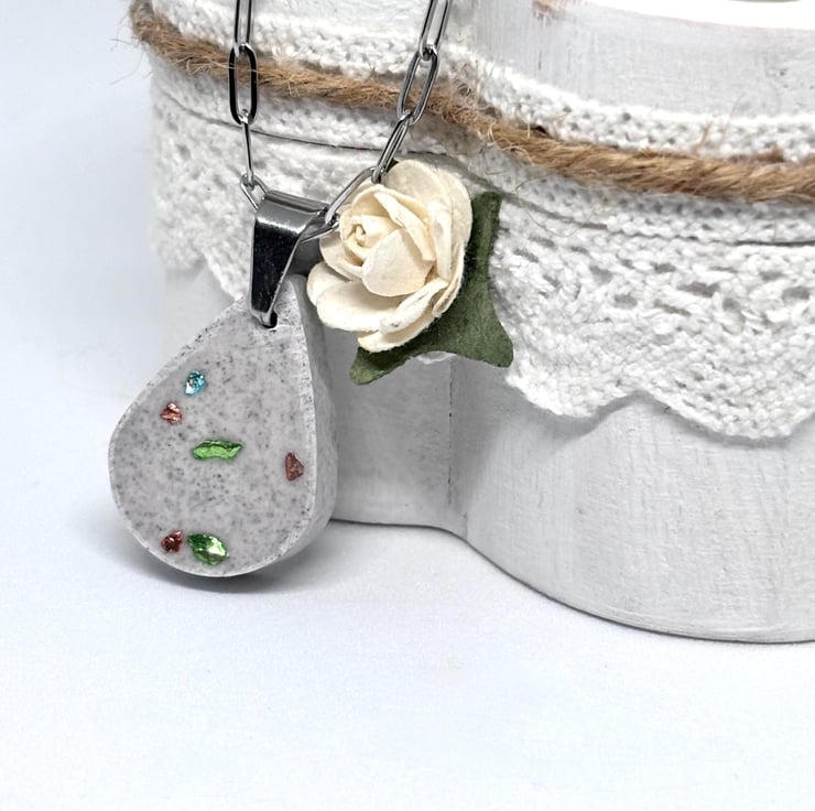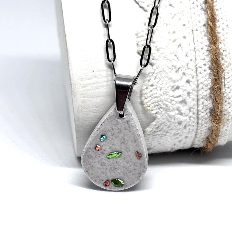 This simple and lovely Jesmonite pendant necklace features a lovely teardrop pendant embedded with a sprinkling of turquoise, gold and green glass chips, it has been given a distressed look and is hung on delicate silver stainless steel paper clip chain with a lobster clasp, both together have a lovely shimmer making it a unique fashion accessory.