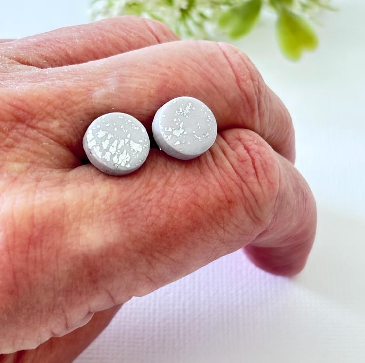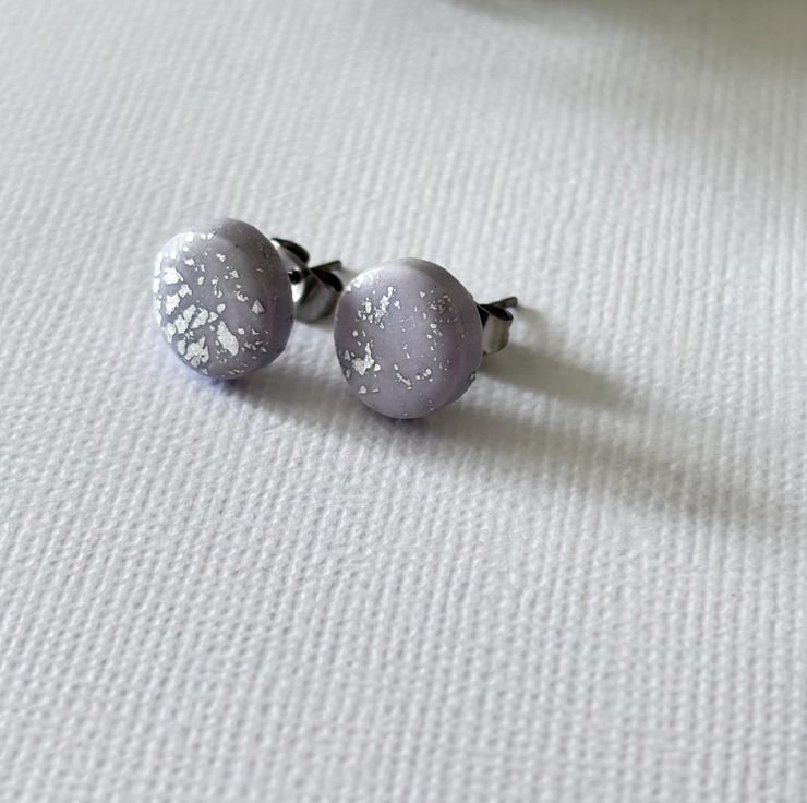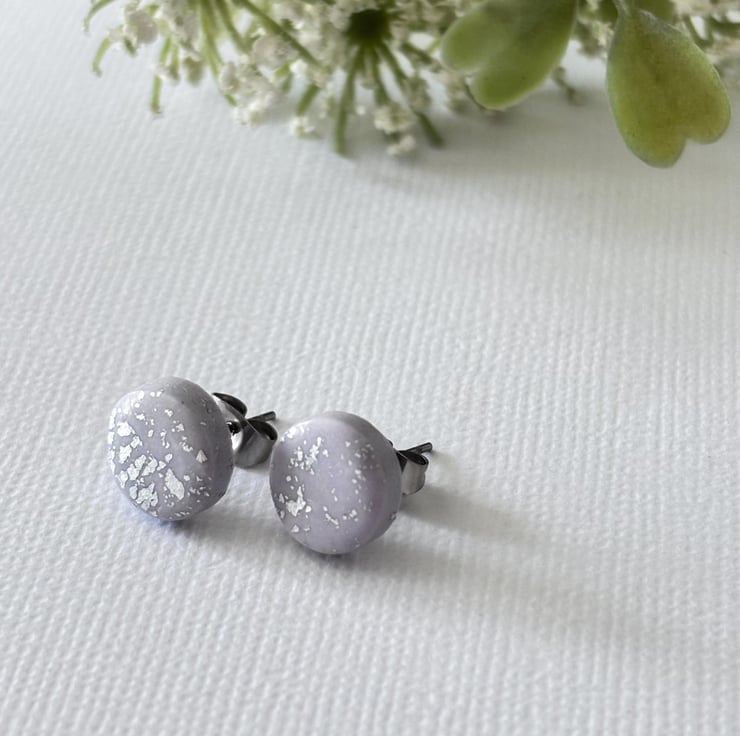 These lovely earrings are handmade in lilac polymer clay and silver foil for a minimalist look you can wear every day.