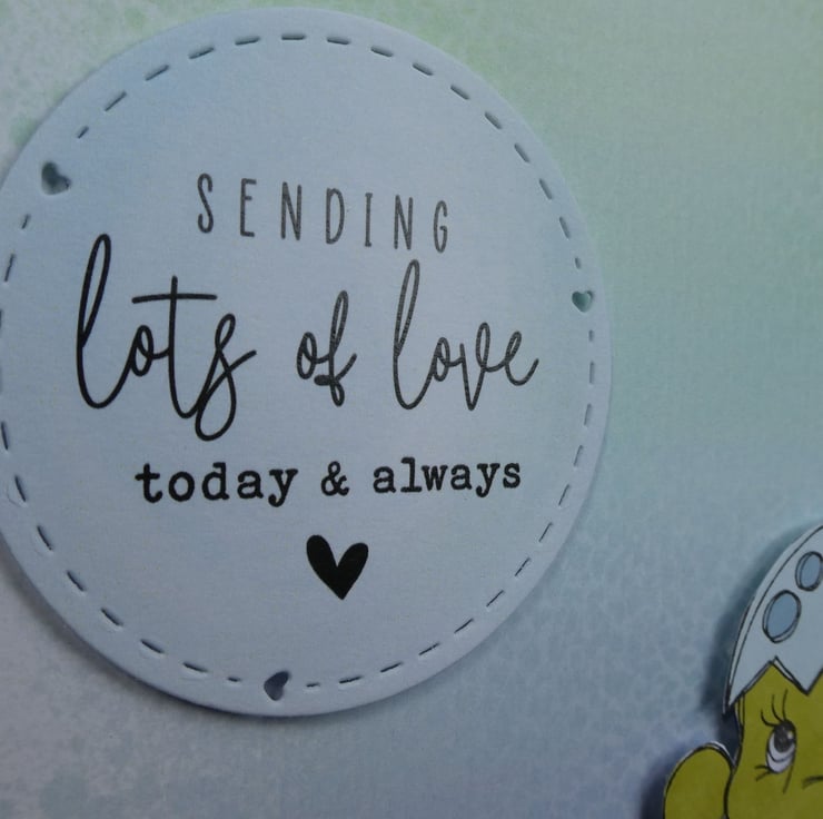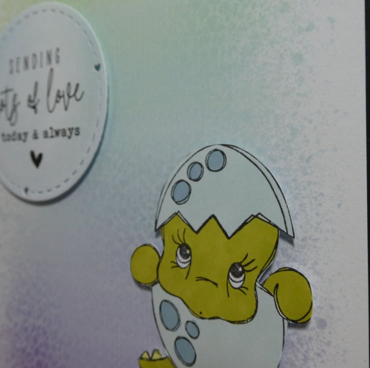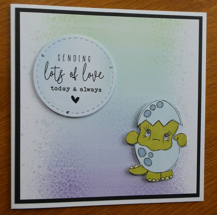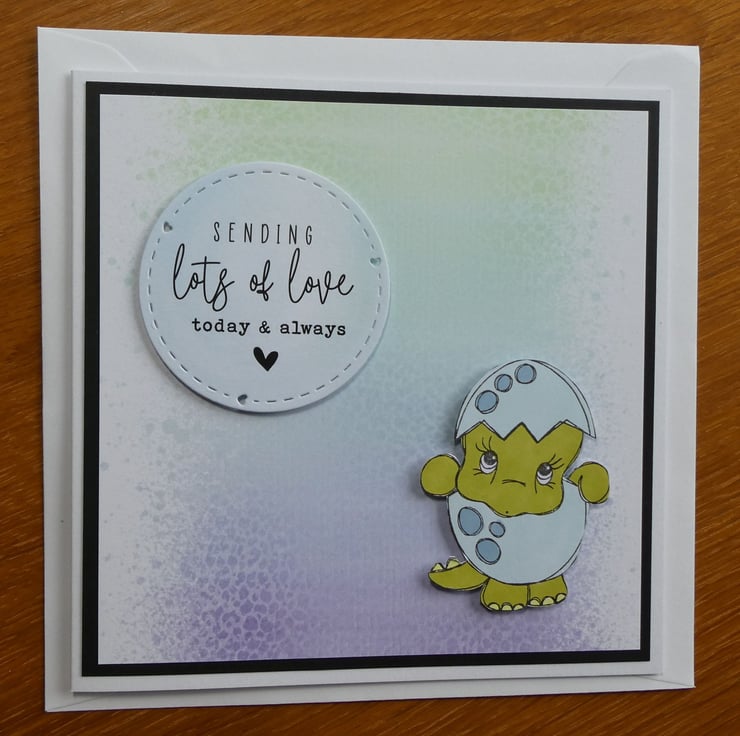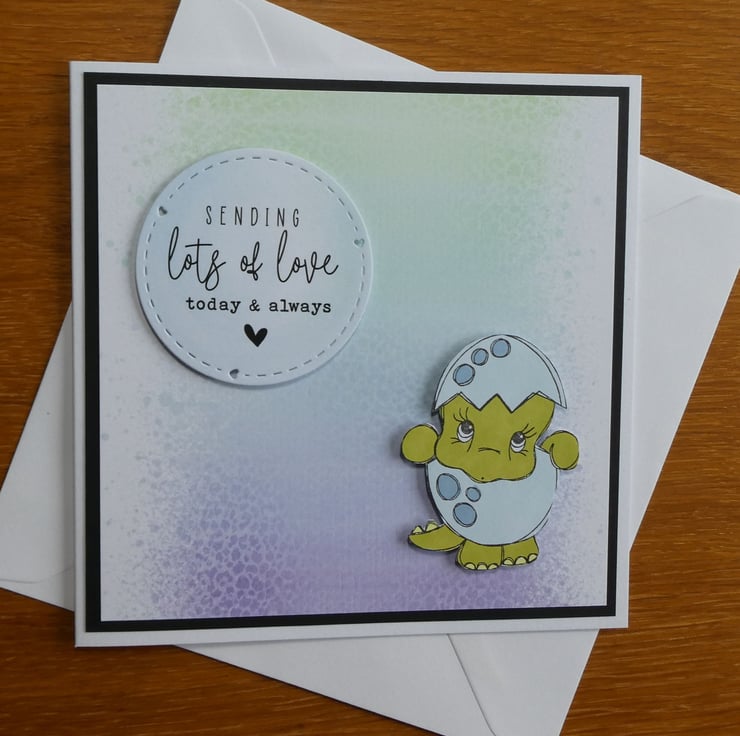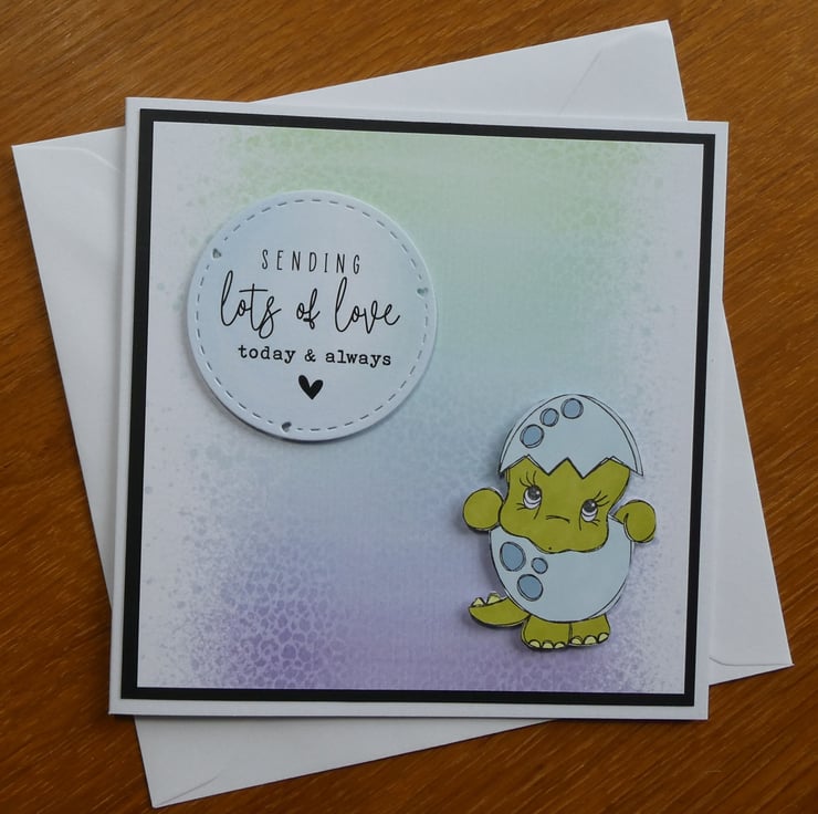 This cute dinosaur birthday card with a sweet image of a dinosaur in an eggshell and the message 'Seding lots of love today & always' would be suitable to send as a birhday card, good luck card or for many other occasions.