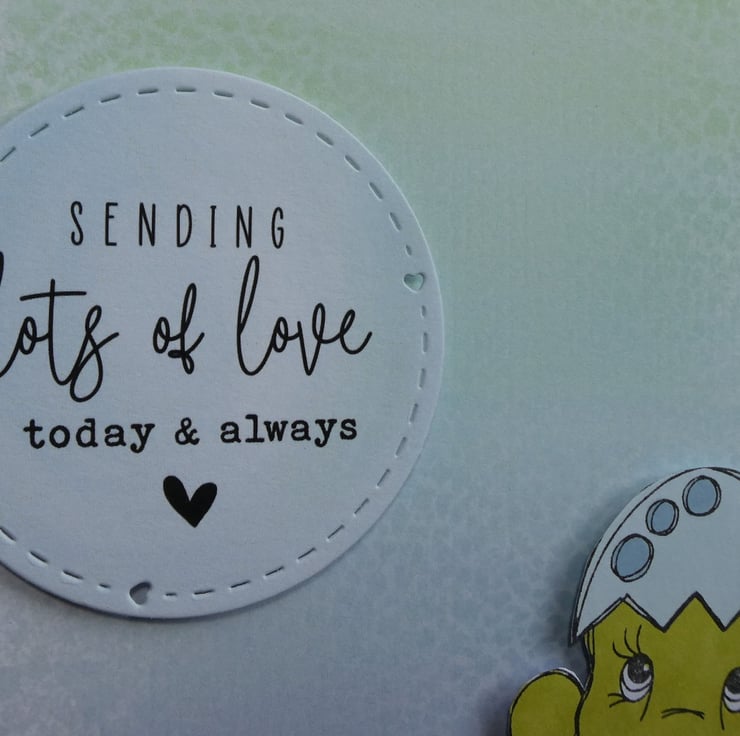 A circular die cut message with the message 'Sending lots of love today and always' on a pale pastel background has been raised on foam pads to add dimension on the left hand side.