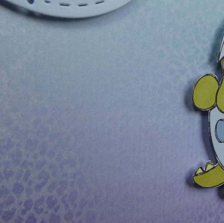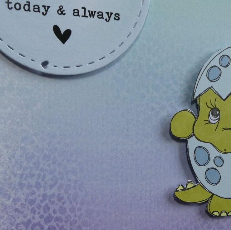 It features a cute dinosaur staning inside an eggshell, which has been hand stamped, inked in shades of blue, lime and moss green and carefully cut.
