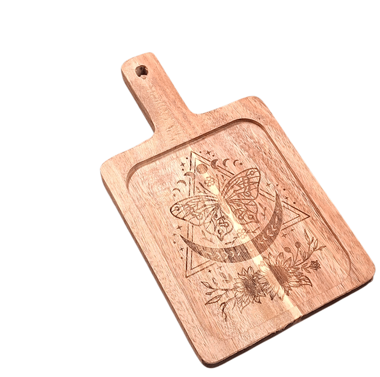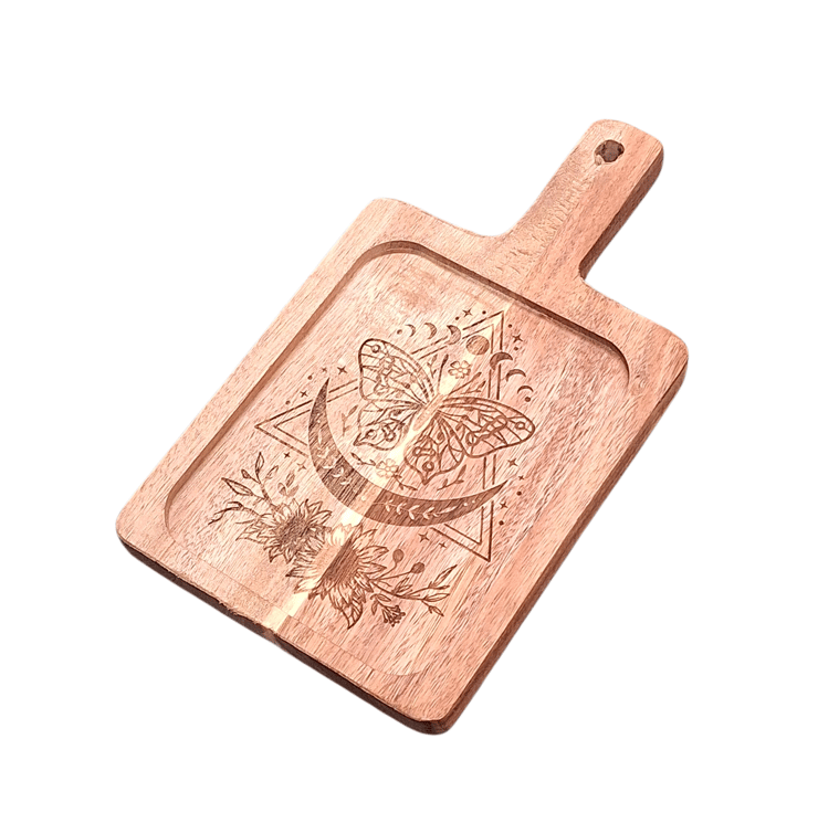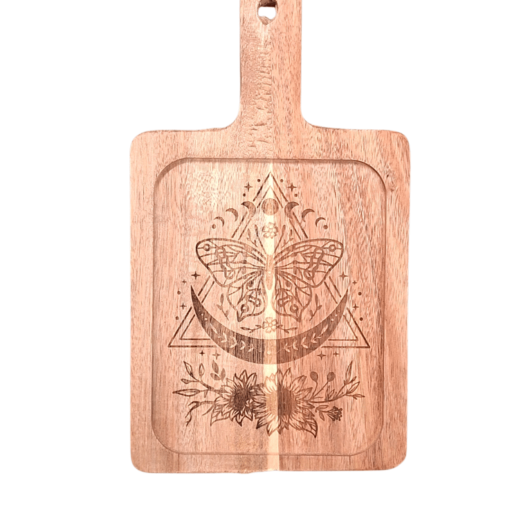 Engraved with a delicate butterfly surrounded by celestial and botanical details, this piece represents transformation, balance, and quiet moments of beauty. The natural grain of the acacia wood brings warmth and individuality to each tray, ensuring no two are ever exactly the same.