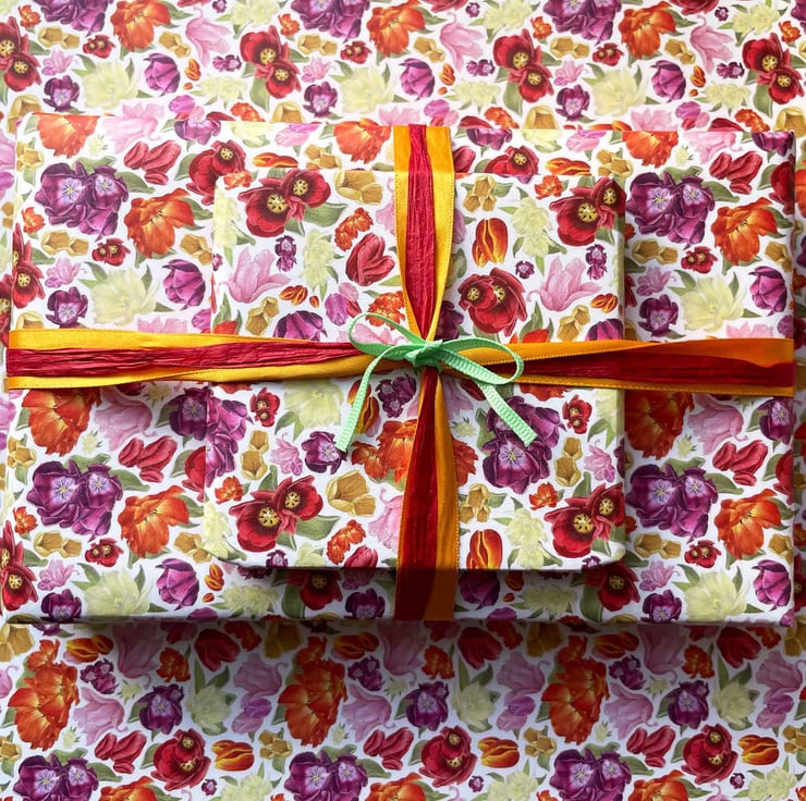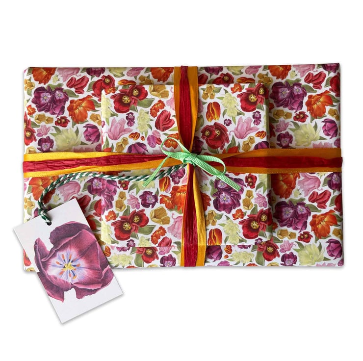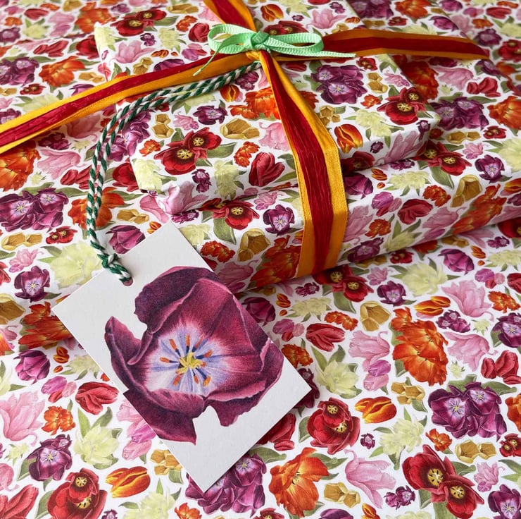 Inspired by the first blooms of spring and the joyful sight of tulips swaying in the sunshine, this design celebrates renewal, colour and simple moments of happiness. Each flower is carefully hand-drawn to capture the charm of a spring garden in full bloom, making this wrap a lovely way to share seasonal joy and heartfelt intentions through beautifully presented gifts.