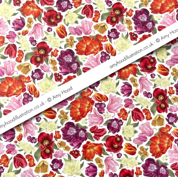 - Design: Hand-drawn colourful tulips on a white background