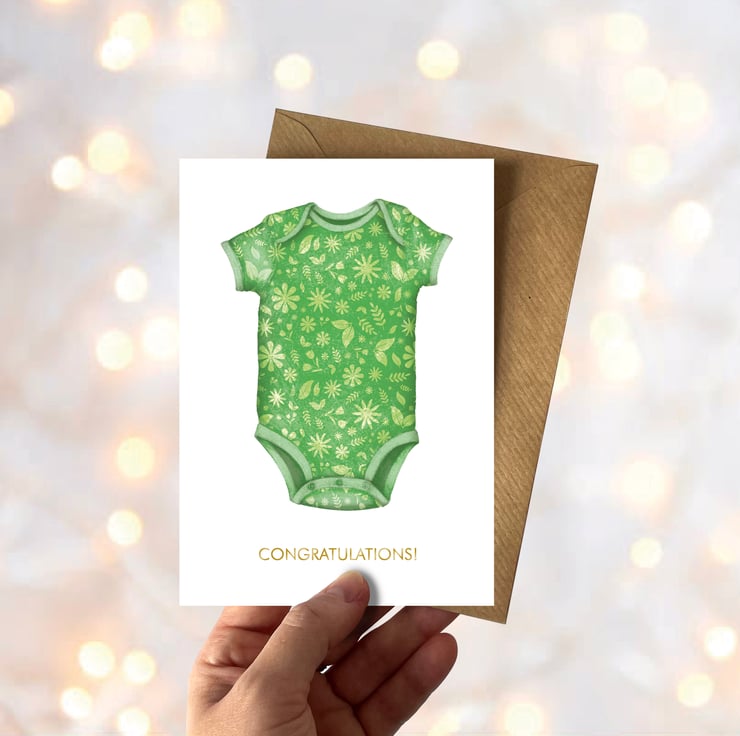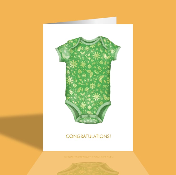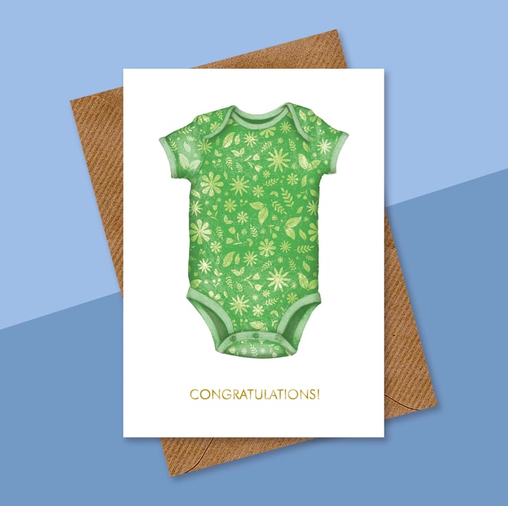 Celebrate the arrival of a little one with this charming new baby greetings card, featuring a bold, hand-drawn illustration of a green baby romper decorated with a bright and playful spring pattern.