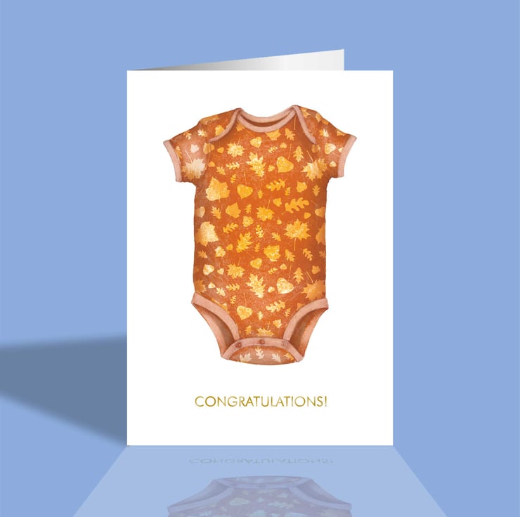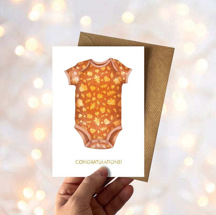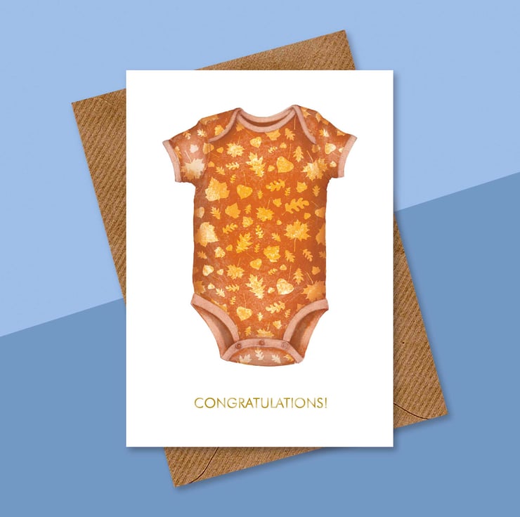Celebrate the arrival of a little one with this charming autumn-inspired new baby greetings card, featuring a bold, hand-drawn illustration of an orange baby romper decorated with a delightful falling leaves pattern. Warm, inviting and full of seasonal charm, this design perfectly captures the cosy feel of crisp autumn days.