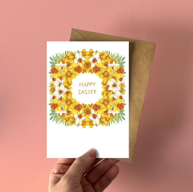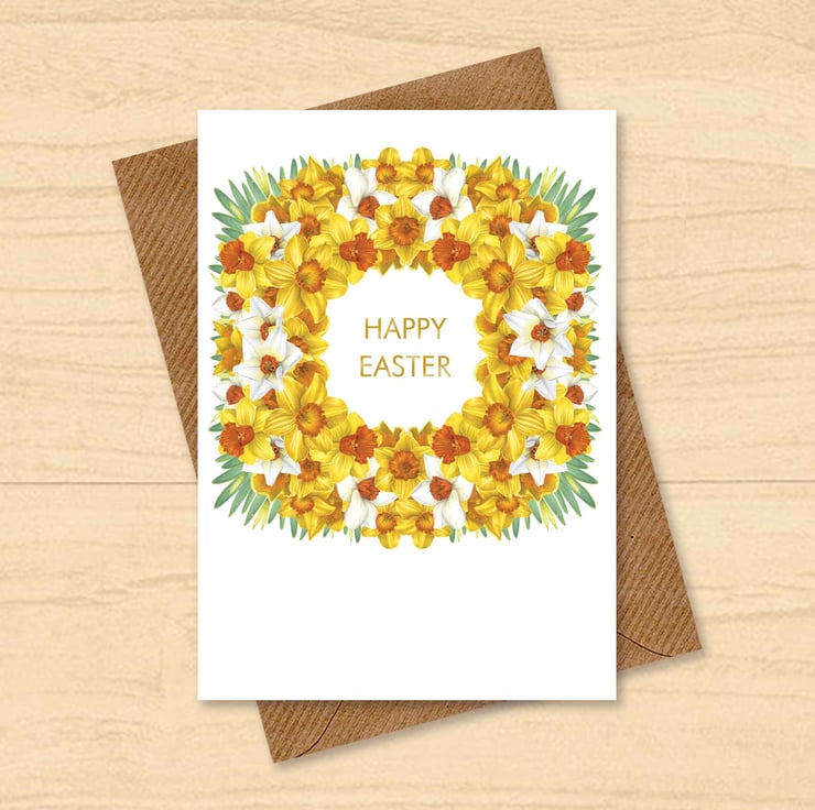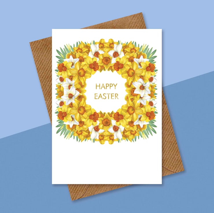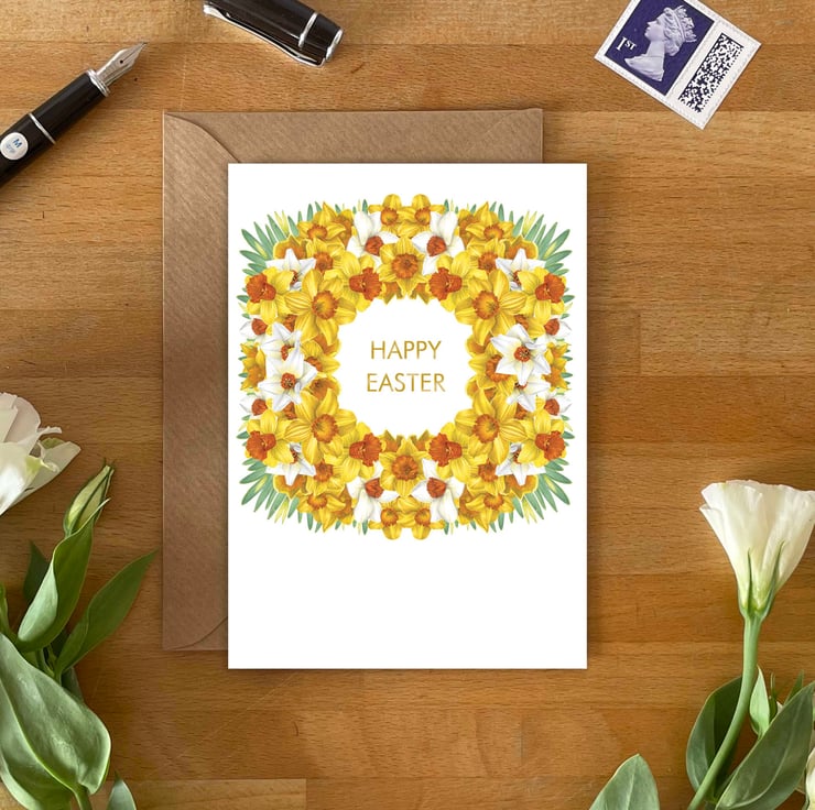 Inspired by the first signs of spring and the cheerful sight of daffodils in bloom, this design celebrates renewal, hope and fresh beginnings. The wreath symbolises togetherness and new life, making this card a meaningful way to mark Easter and share joyful seasonal wishes.