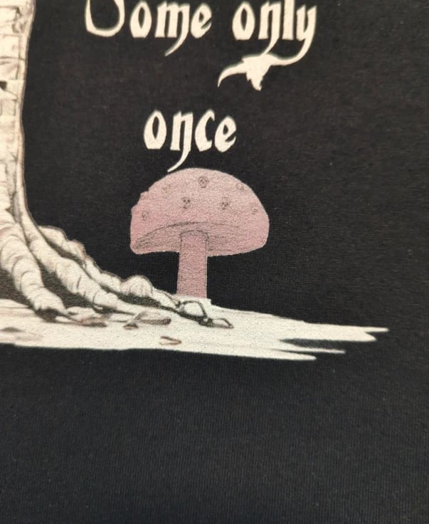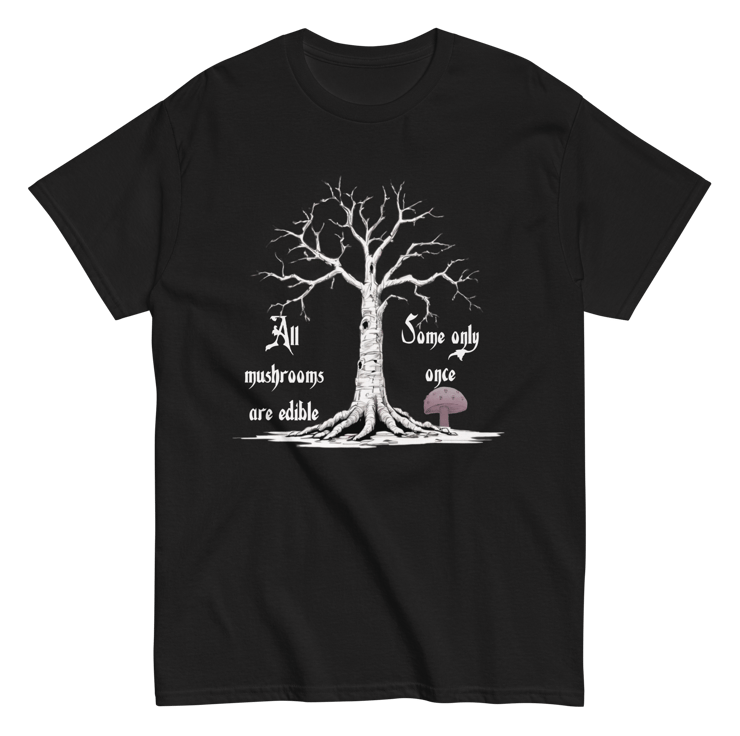 Add a touch of dark wit to your wardrobe with this original graphic tee from Kate&Fate. Featuring a hauntingly detailed white birch tree and a subtle mushroom illustration, this design plays on the classic forager's joke: "All mushrooms are edible... some only once."