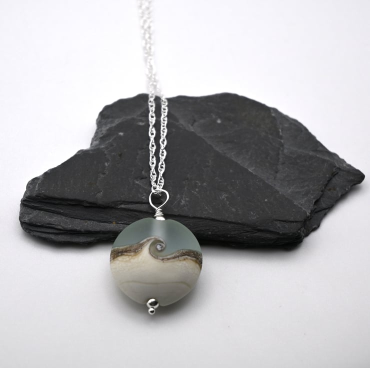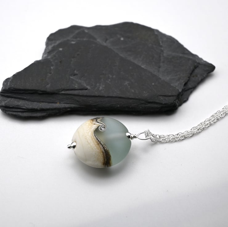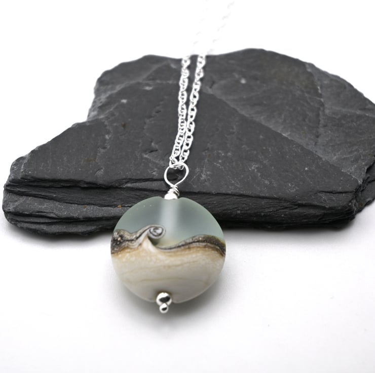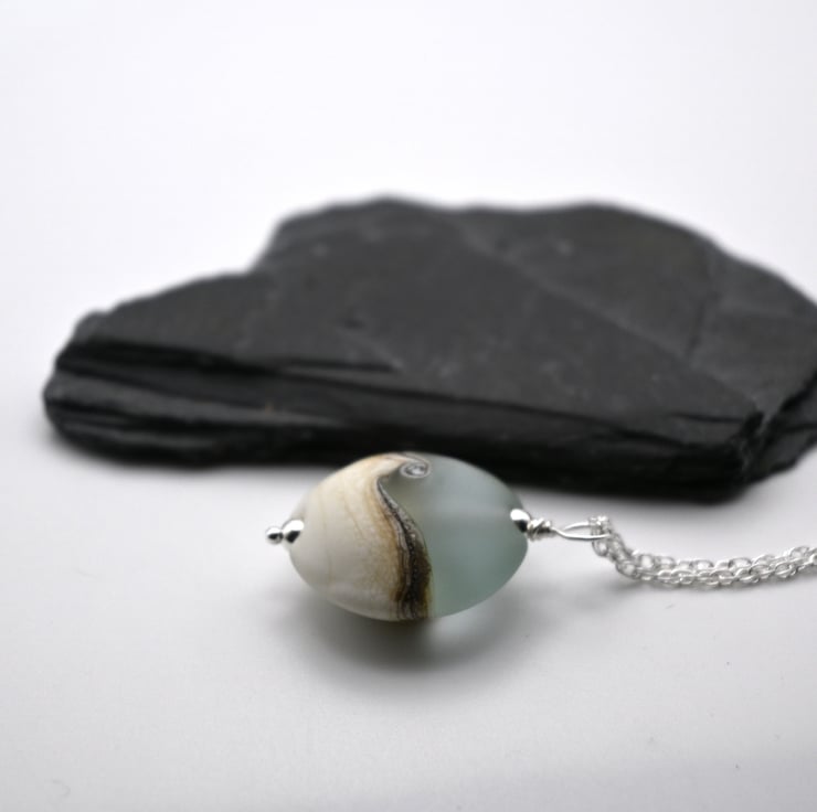 A sterling silver chain necklace strung with a handmade lampwork glass pendant.