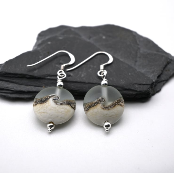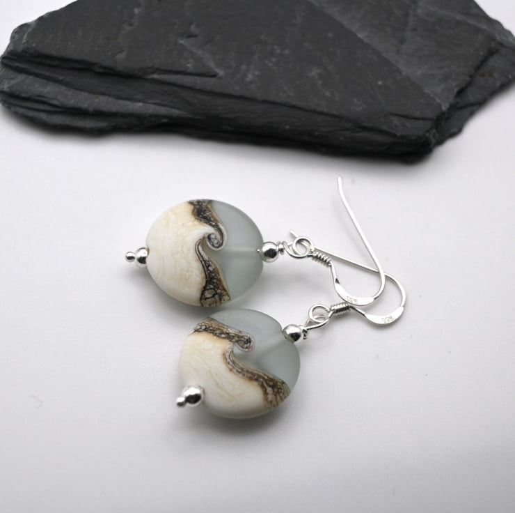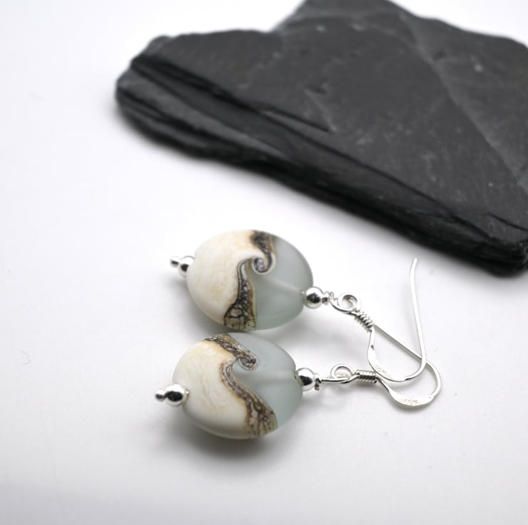 A pair of sterling silver earrings featuring pale blue frosted glass lampwork beads which have been wrapped with an ivory swirl.
