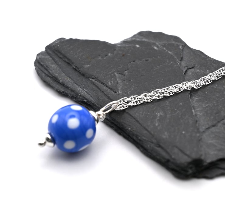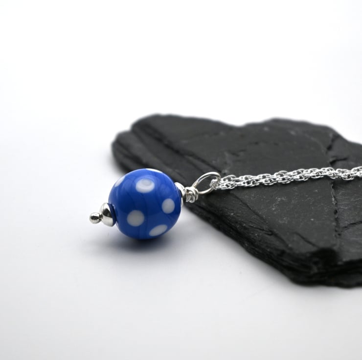 The pendant has been made with blue glass and features white polka dots.