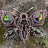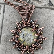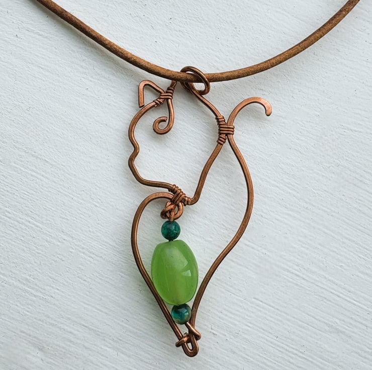 Antique copper wire wrap Cat shaped pendant with a green Chalcedony bead and two 3mm blue Apatite beads. Comes with a 20"/50cm brown leather thong and antique wire fastenings..