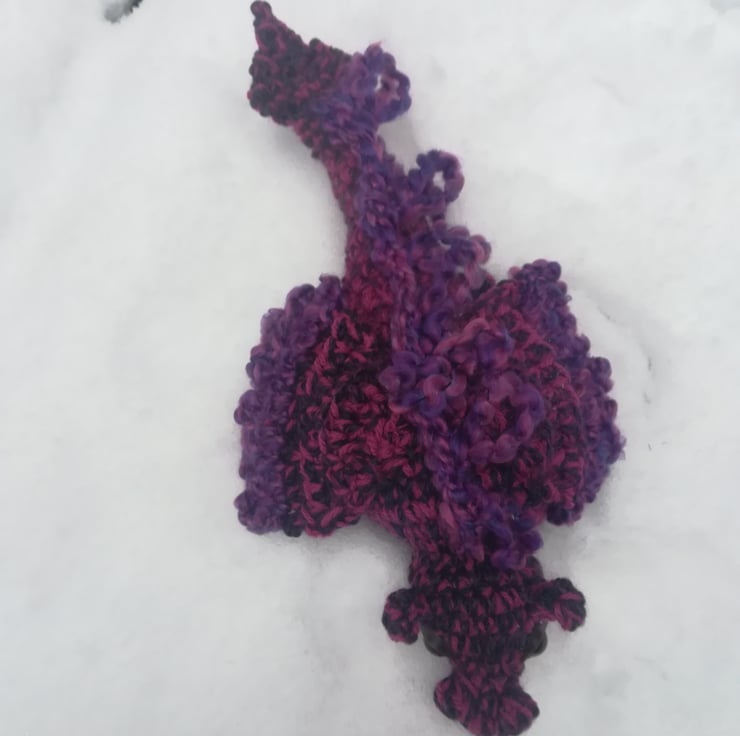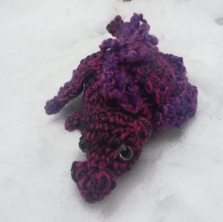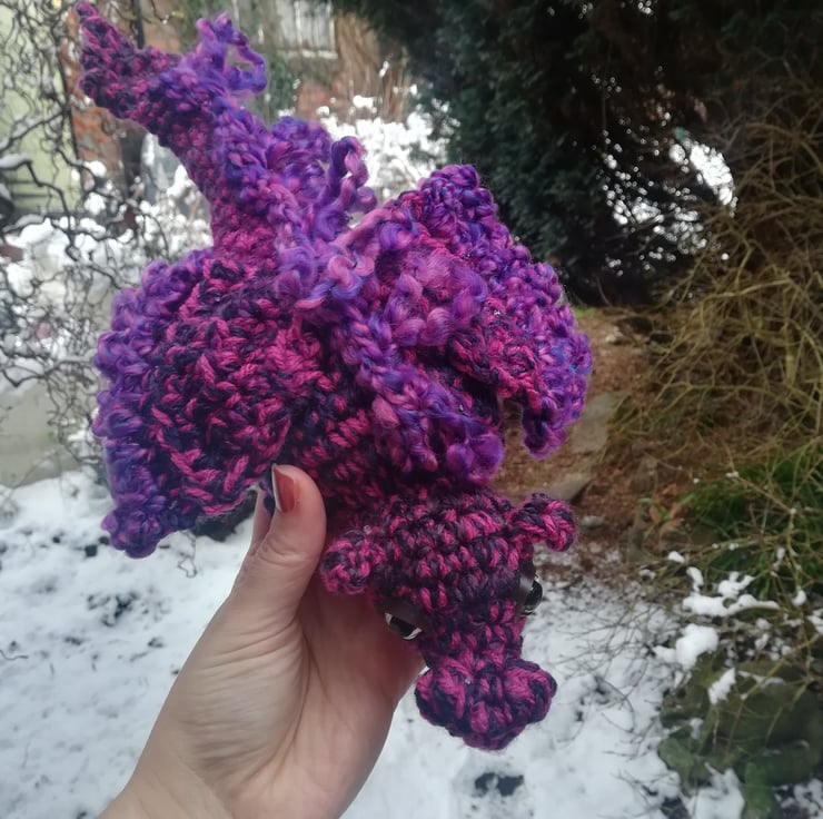 This dragon is made from a lovely soft mottled yarn in pretty colours of purple and blue. It's a great display piece for your desk or shelf.