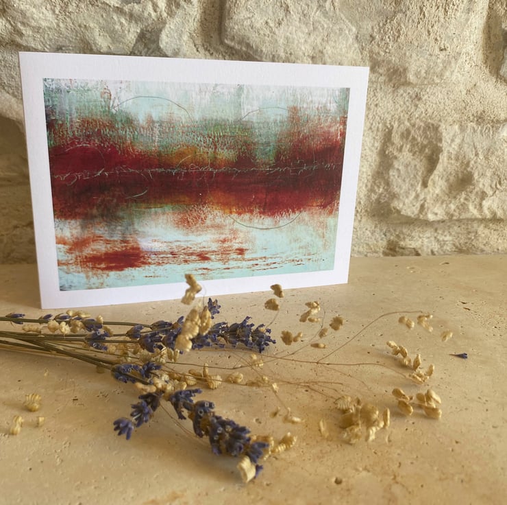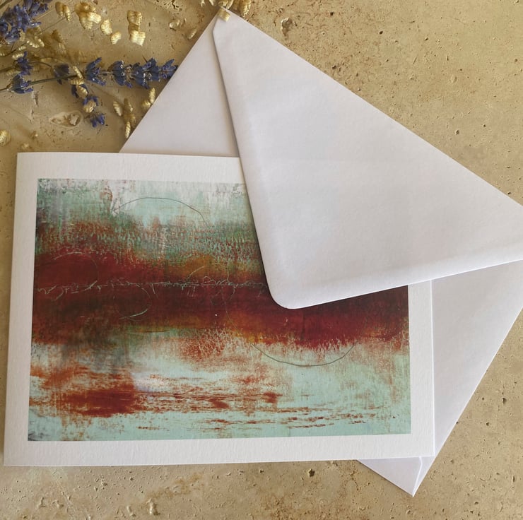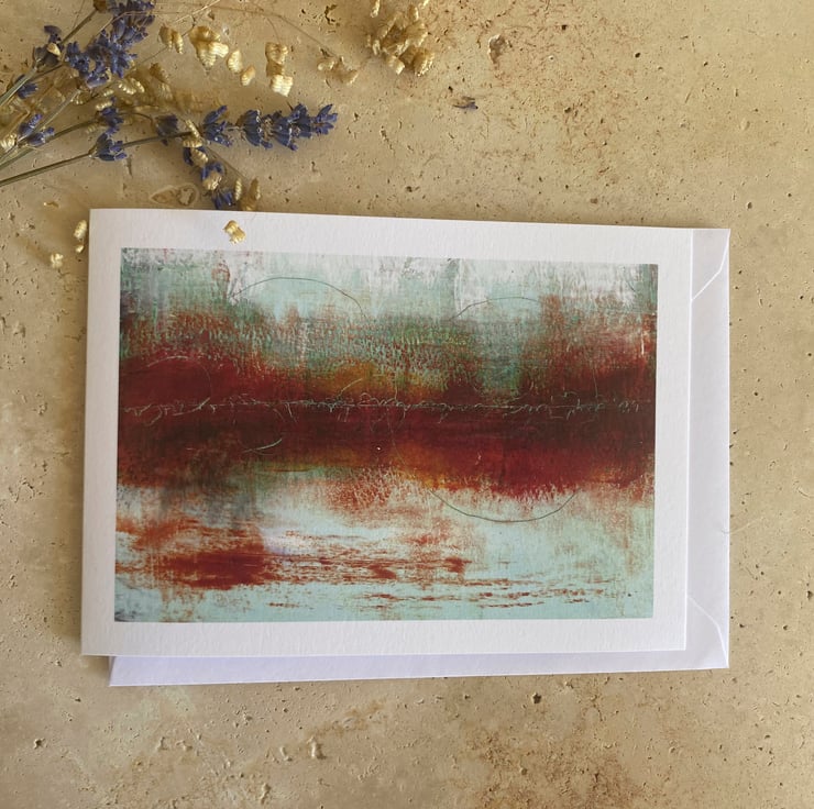 This Fine Art greeting card features a digital reproduction print of my original artwork. The original art work is an atmospheric abstract painting in deep reds and pale sea greens and is painted in oil paint and cold wax.