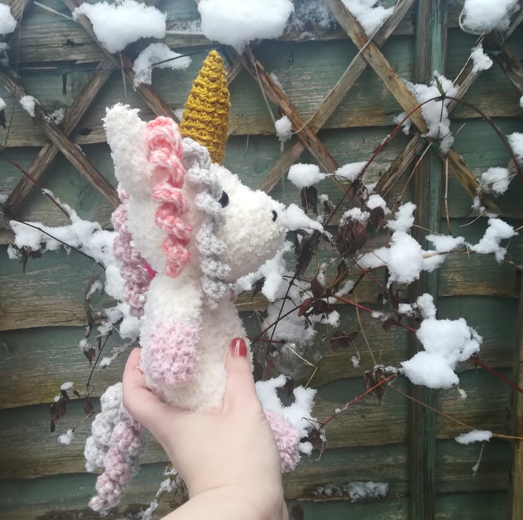 This beautiful crochet unicorn is truly a one-off and completely magical. She's made using a lovely fluffy yarn and has a beautiful mane and tail. Makes a great companion or display piece.
