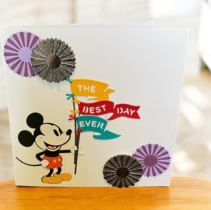 This cheerful card was inspired by those big, bright days worth shouting about—the kind where excitement bubbles over and every little moment feels magical. The bold colours, playful flags, and rosette details capture the joy of childhood celebrations and the timeless charm of classic characters. It’s designed to bring a smile, spark a memory, and make any special day feel like the very best one ever.