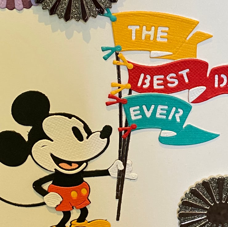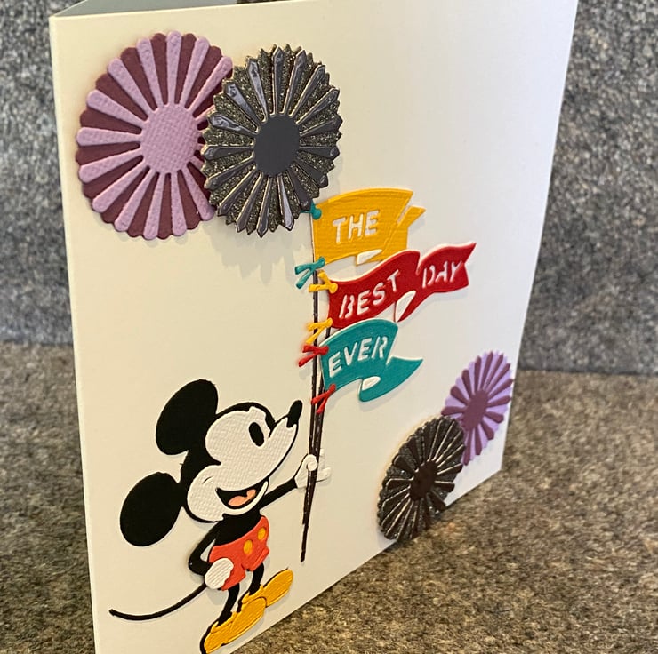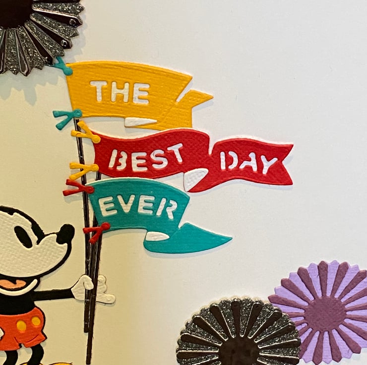 Make someone’s day sparkle with this joyful, handcrafted card featuring none other than Mickey Mouse in full celebratory swing! Mickey stands proudly holding a flagpole strung with cheerful pennants in sunny yellow, bold red, and sky blue, spelling out THE BEST DAY EVER in playful block letters.