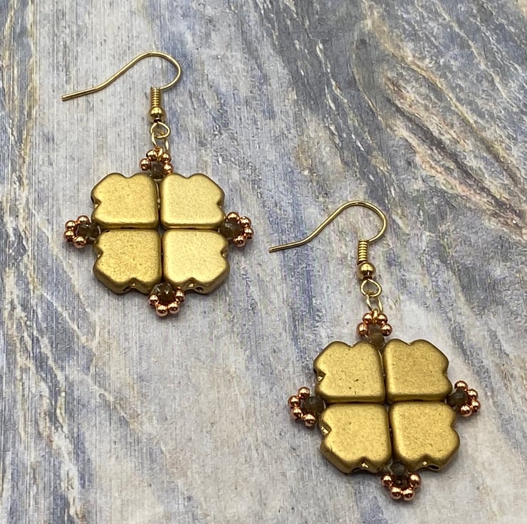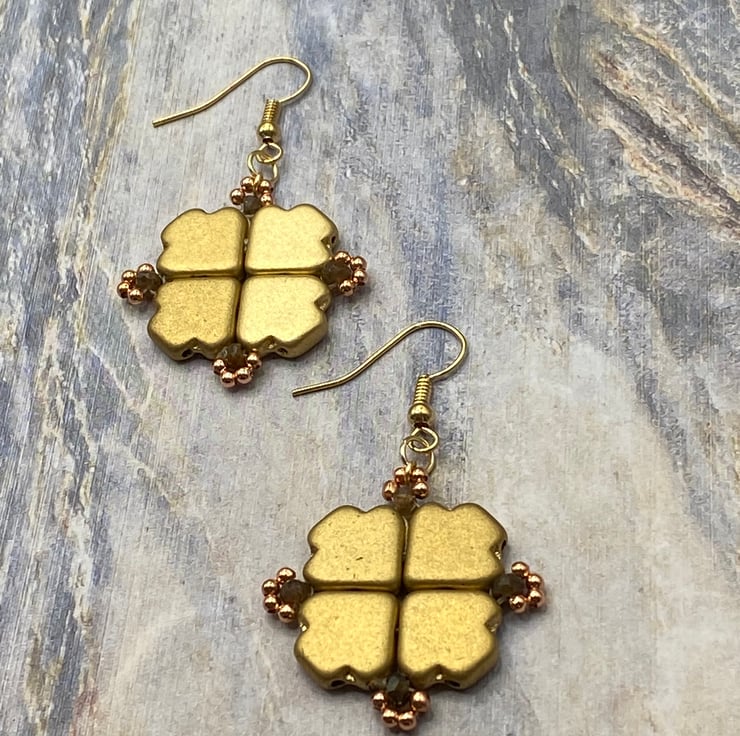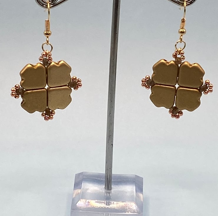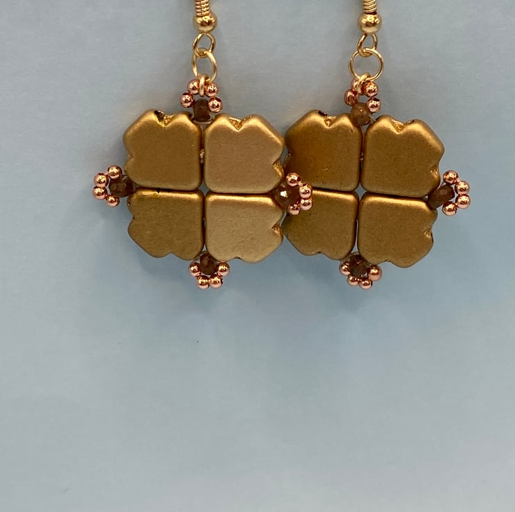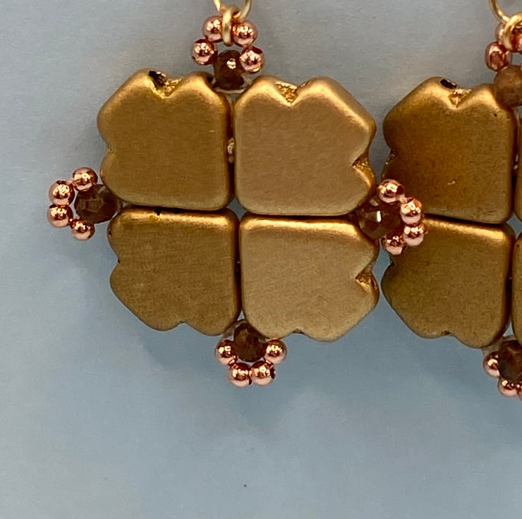 For these earrings, I used god coloured Czech dart beads and because of their shape I thought they'd look good woven together in a square. Each bead has two sets of holes so I was able to sew several times round them securely, adding a 3mm andalusite stone and tiny rose gold plated beads in a loop at each corner.