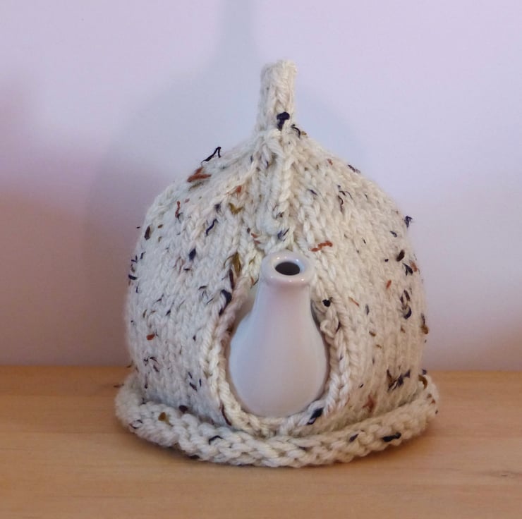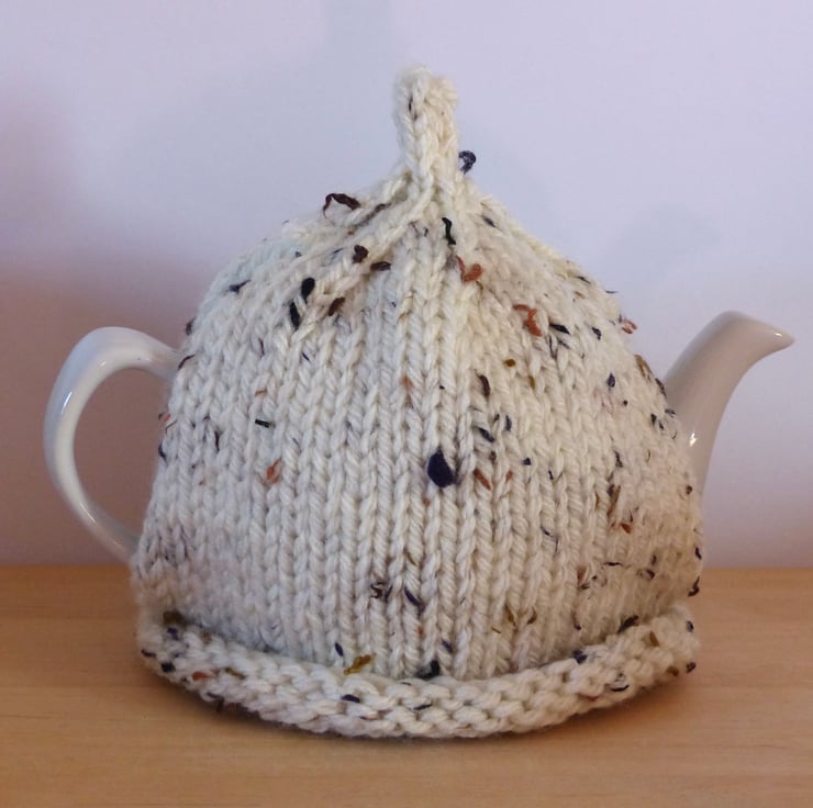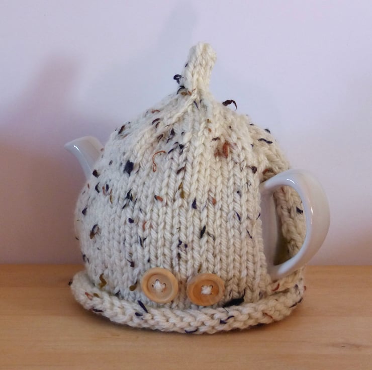 A hand knitted Tea Cosy in a chunky Oatmeal coloured yarn which has flecks of Black and Brown. It has a 'pixie' top and two natural wood buttons on the front for decoration.