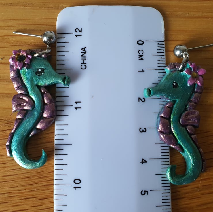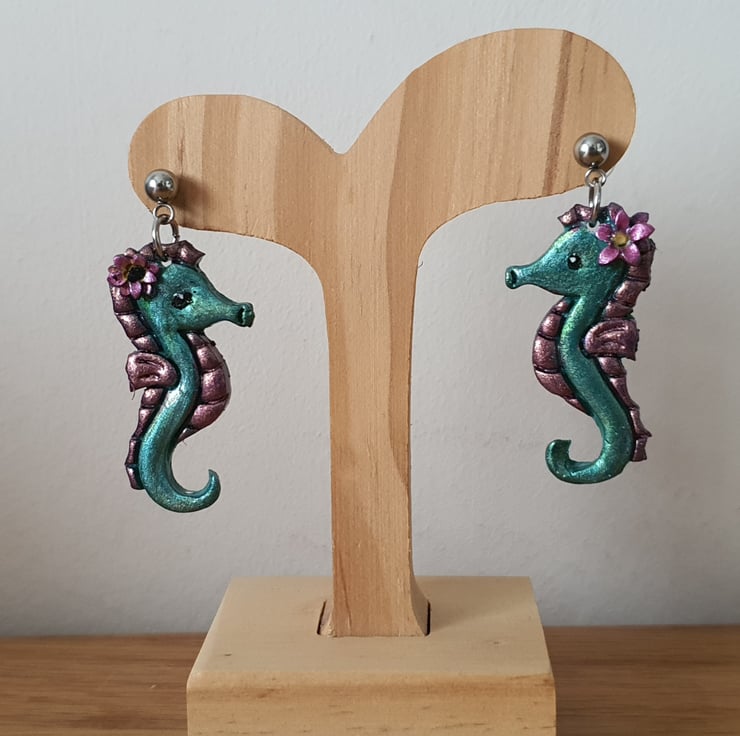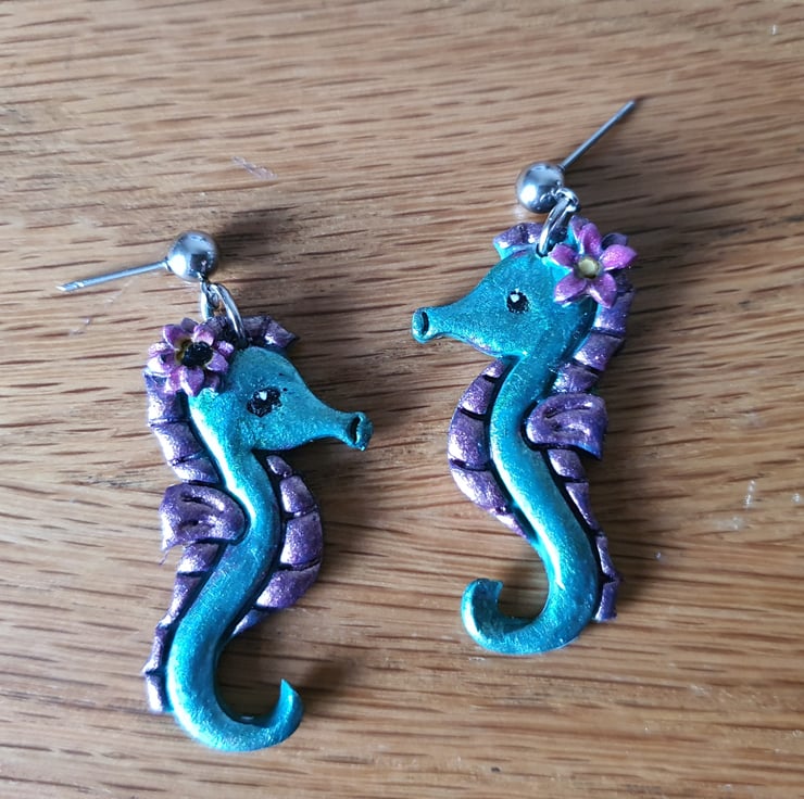 Cute handmade Seahorse Earrings with surgical steel ball studs. They have been painted with metallic-effect paint and finished off with a coat of varnish.