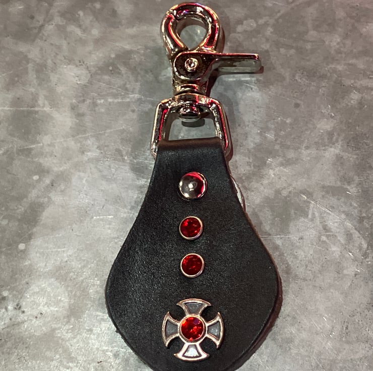 Black Leather Keyring with Iron Cross Design & 3 Red Gemstones - FREE SHIPPING